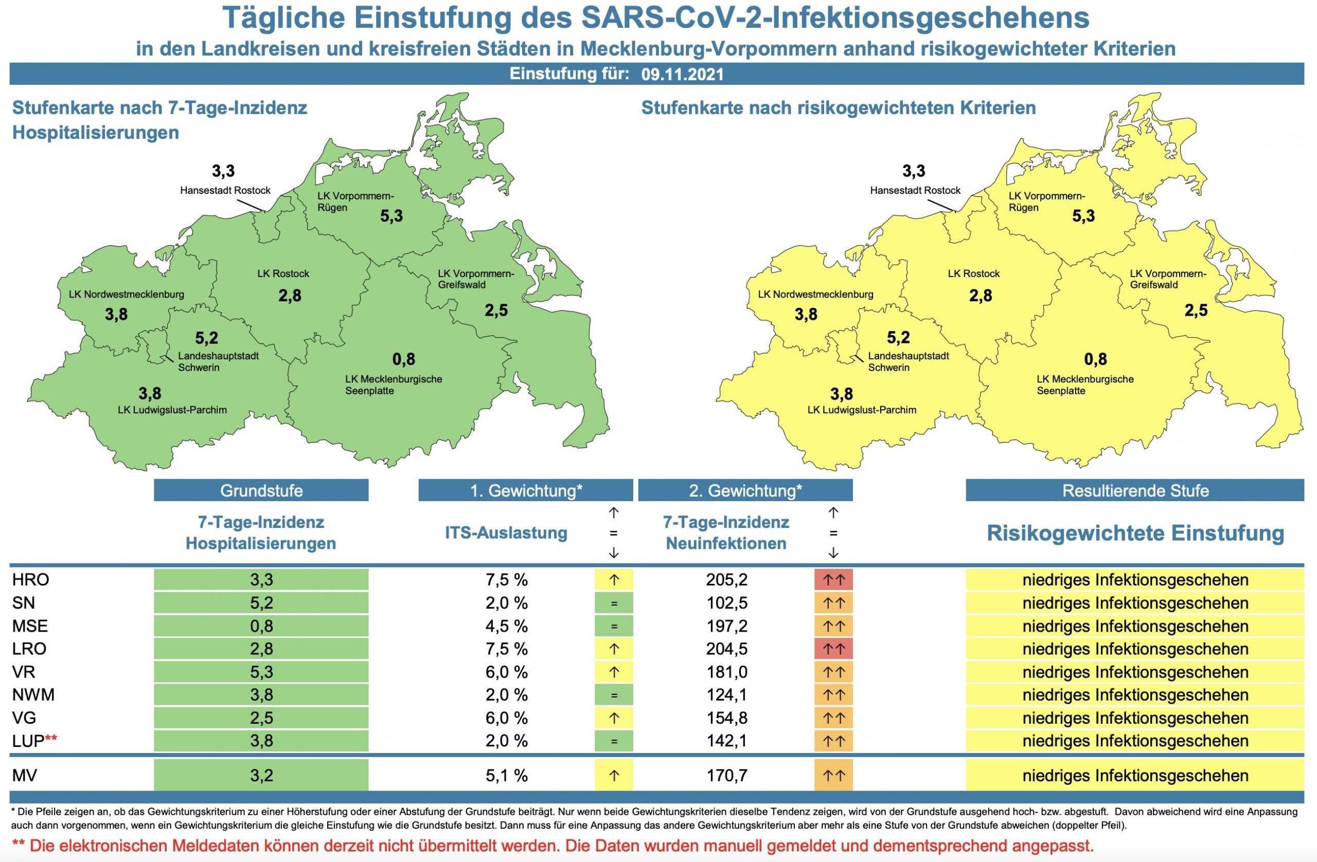 Die Hospitalisierung in ganz Mecklenburg-Vorpommern ist von 2,7 auf 3,2 gestiegen. Die Inzidenz des Landes stieg von 156,2 auf 170,7. Das Land Mecklenburg-Vorpommern meldet heute mit 726 Neuinfektionen sowie viele wie noch nie und einen neuen Todesfall.