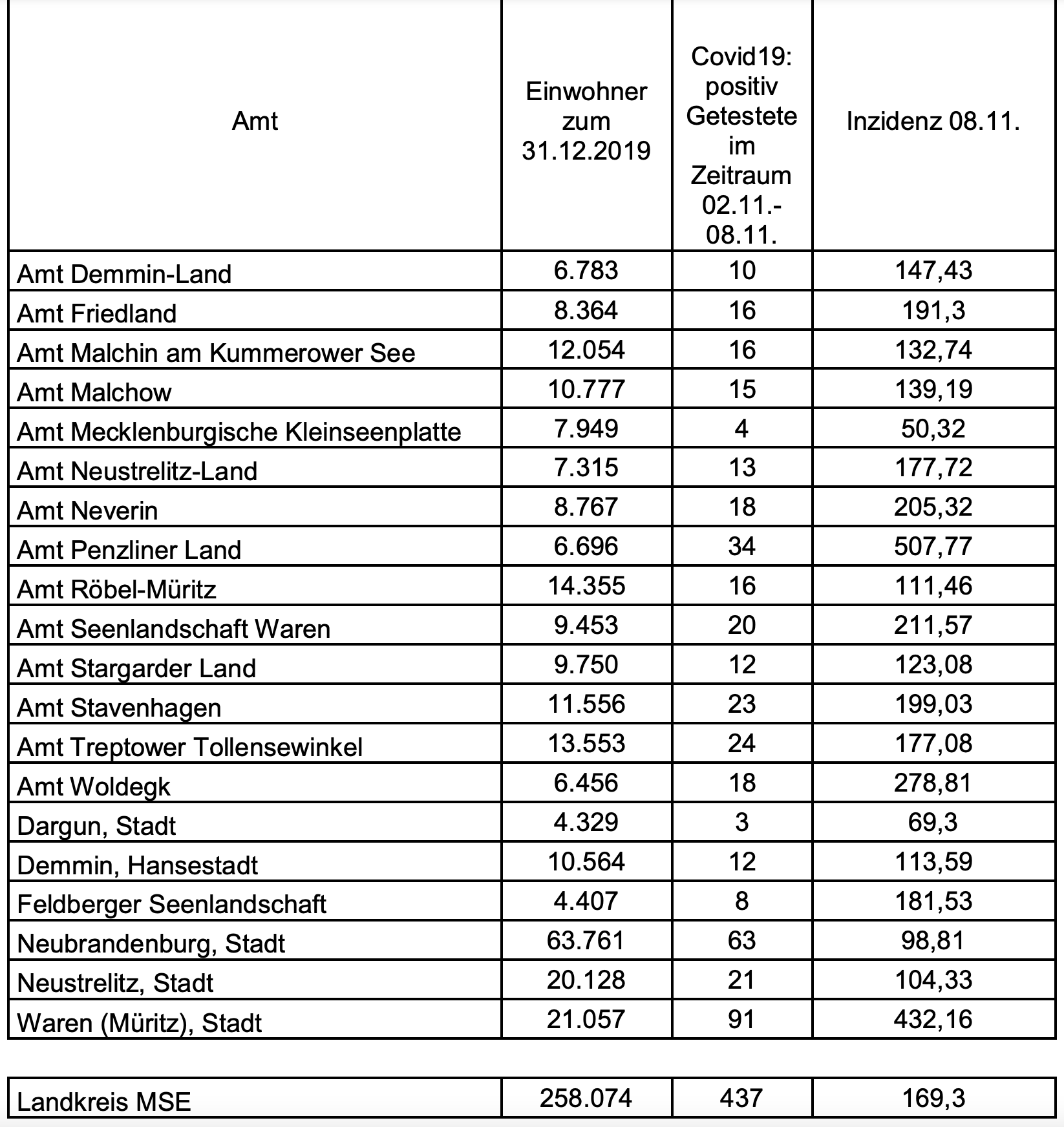 Die Inzidenz an der Mecklenburgischen Seenplatte ist erneut deutlich gestiegen von 169 auf 197,2. Der Hospitalisierungs-Wert stieg von 0,0 auf 0,8. Der Landkreis meldet heute 124 Neuinfektionen und keinen neuen Todesfall. Aus den heute ebenfalls veröffentlichten Inzidenzen der Städte und Ämter im Landkreis Mecklenburgische Seenplatte geht hervor, dass die Stadt Waren derzeit eine Inzidenz von 432,16 und das Amt Penzliner Land sogar von 507,77 hat. Die aktuelle Übersicht finden Sie in diesem Artikel.