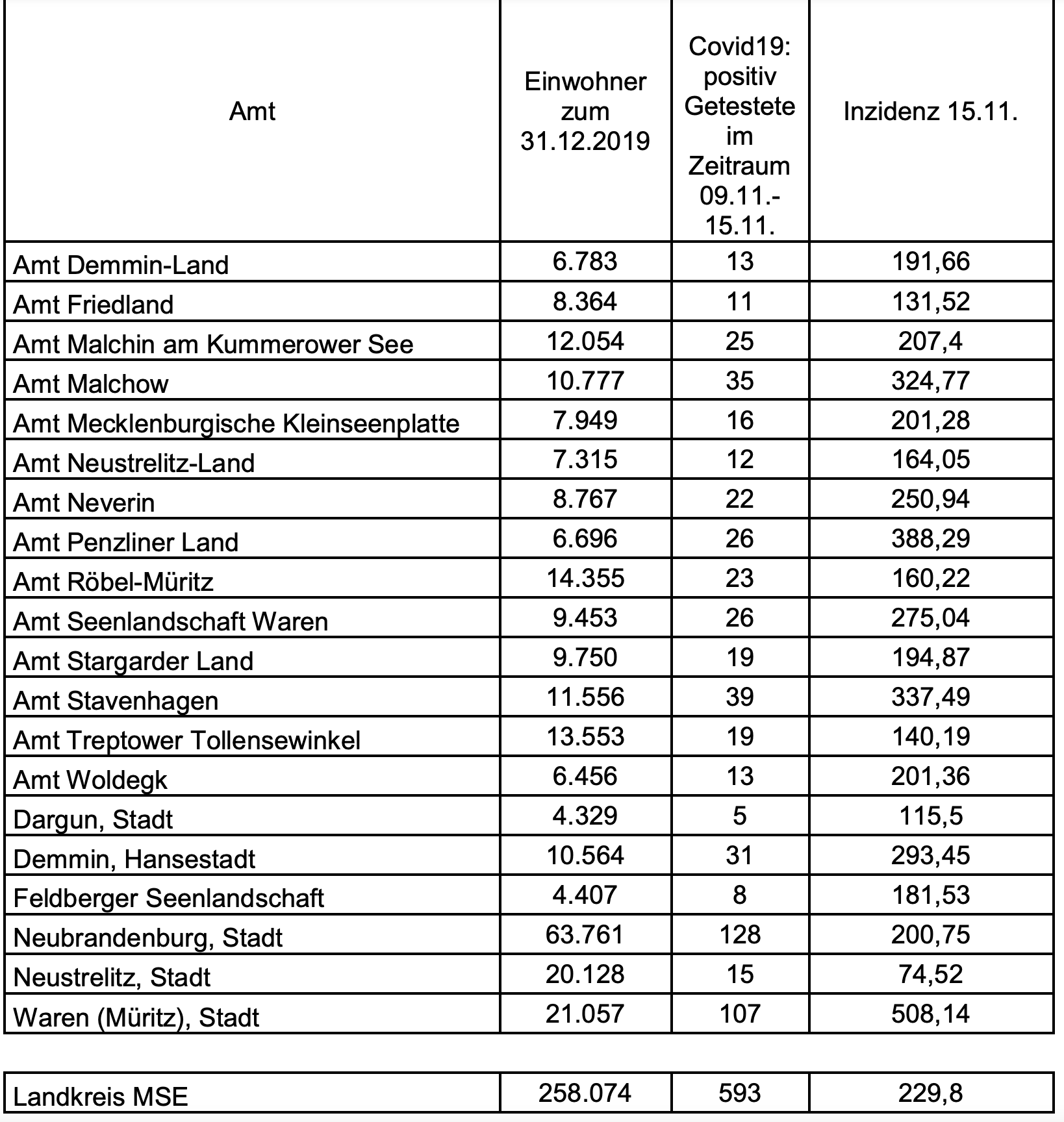 Die Situation in den Corona-Stationen und in den Intensivstationen der Krankenhäuser ist auch im Landkreis Mecklenburgische Seenplatte inzwischen sehr angespannt und spitzt sich weiter zu. Im Gesundheitsamt arbeiten jetzt wieder weitere 9 Mitarbeiter aus der Verwaltung in der Nachverfolgung mit. Täglich werden zwischen 250 bis 300 Abstriche für PCR-Test genommen.