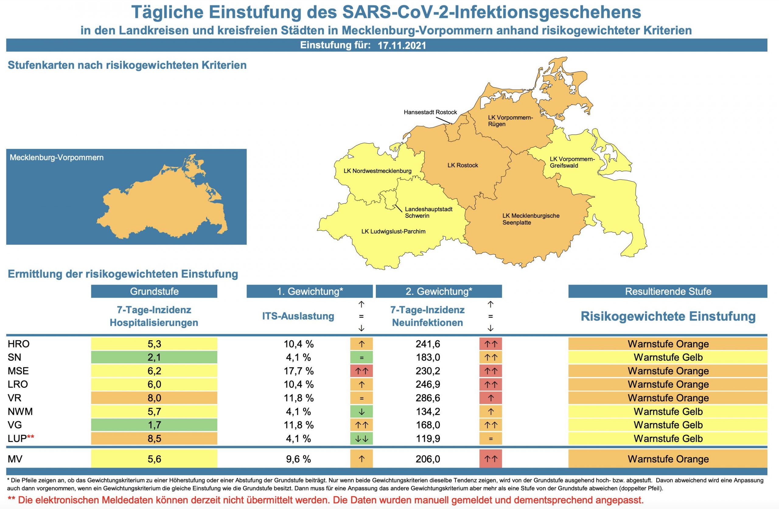 Die Hospitalisierung in ganz Mecklenburg-Vorpommern wird heute mit 5,6 angegeben (gestern 5,6). Die Inzidenz des Landes steigt von 193,8 auf 206,0. Das Land Mecklenburg-Vorpommern meldet heute mit 927 Neuinfektionen – wieder so viele wie noch nie – und drei neue Todesfälle.
