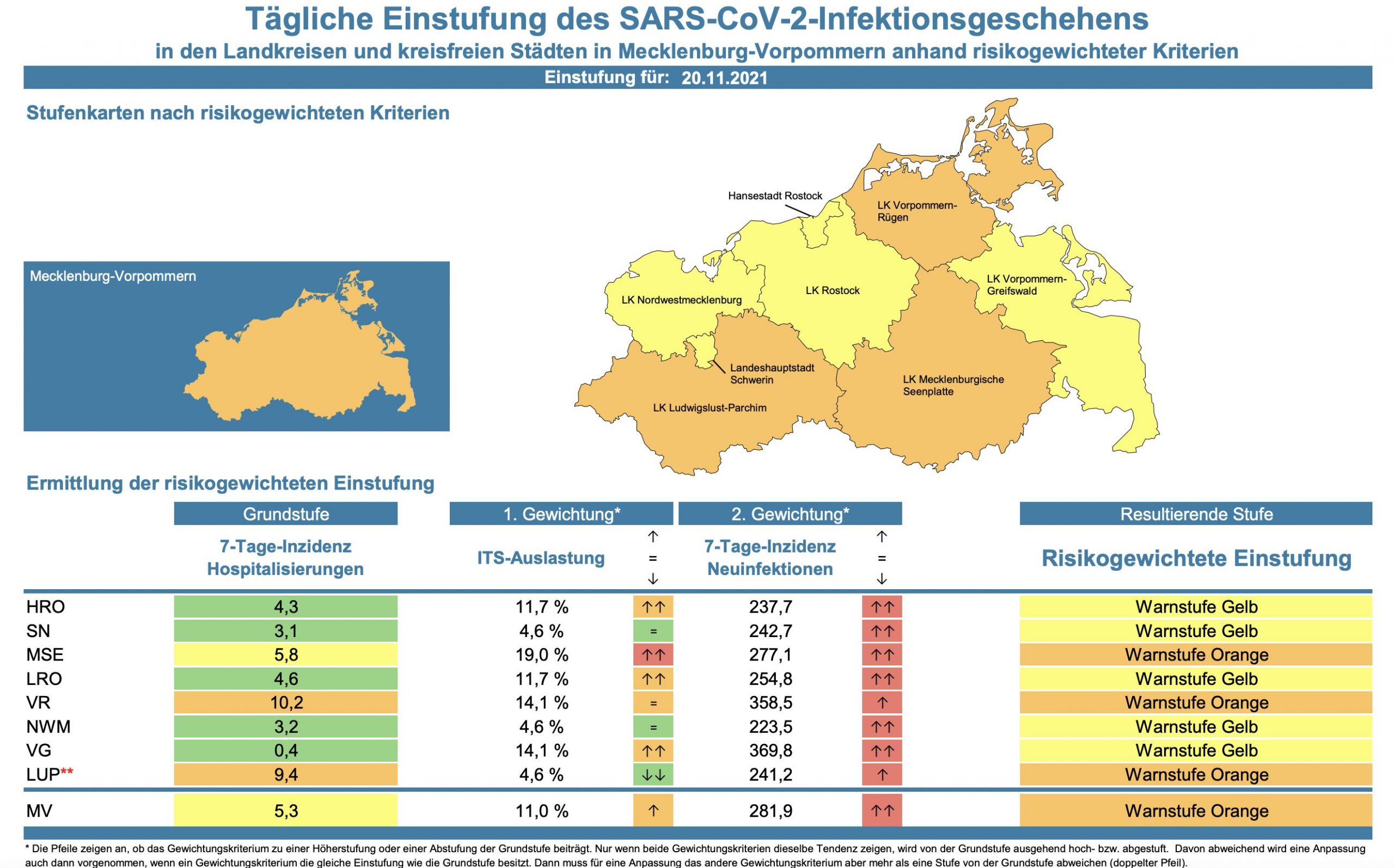 Die Hospitalisierung in ganz Mecklenburg-Vorpommern wird heute mit 5,3 angegeben (gestern 5,5). Die Inzidenz des Landes steigt von 264 auf 281,9. Das Land Mecklenburg-Vorpommern meldet heute 736 Neuinfektionen und einen neuen Todesfall.