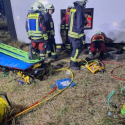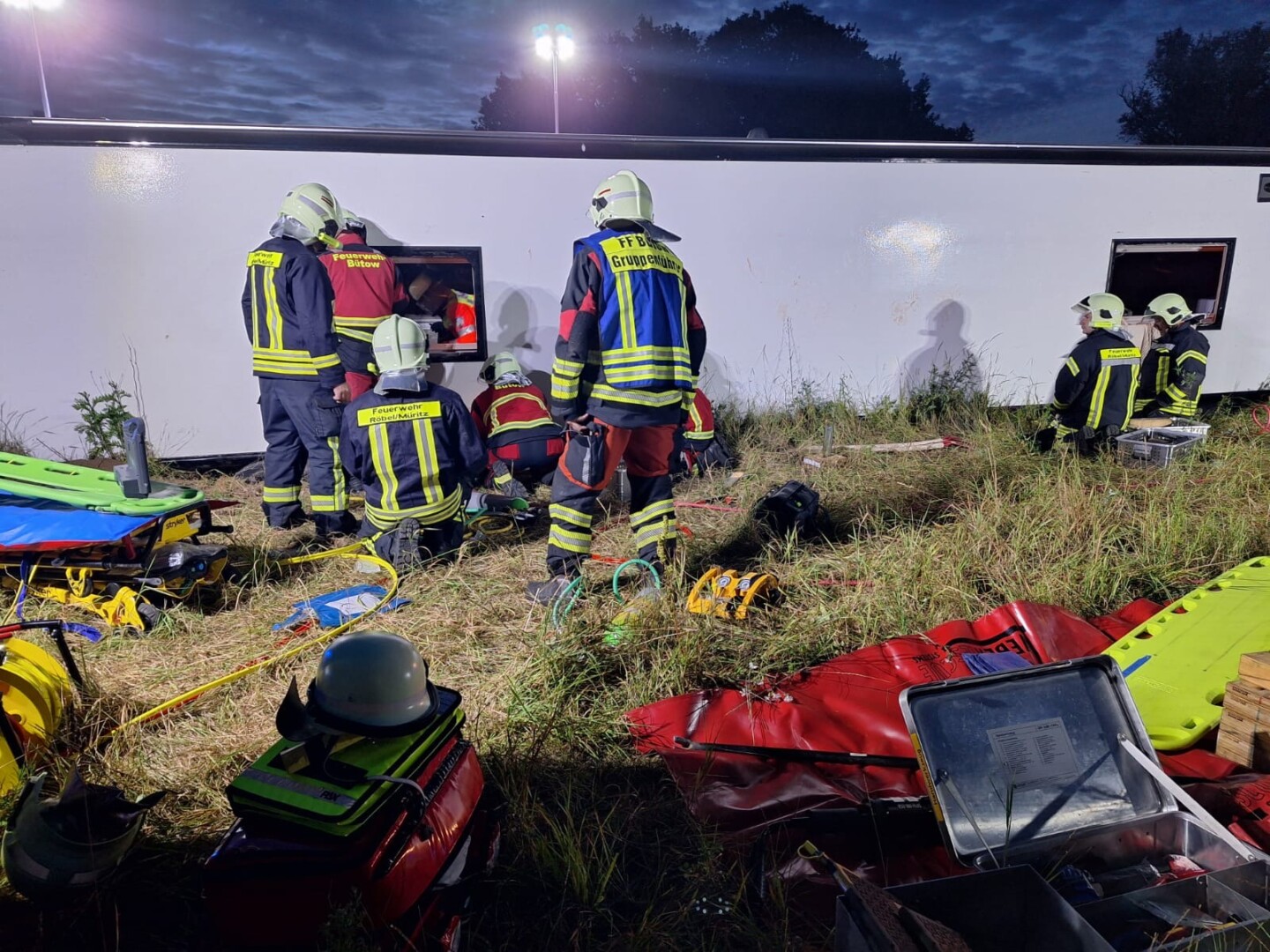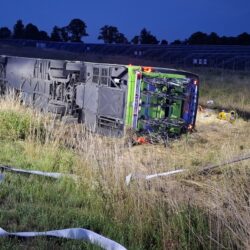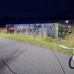 Schweres Busunglück heute früh gegen 2.40 Uhr auf der A 19 bei Röbel: Aus bislang ungeklärter Ursache kam kurz hinter der Anschlussstelle Röbel Richtung Berlin ein Flixbus nach rechts von der Fahrbahn ab und kippte auf die Seite. Der Bus, der die Linie Kopenhagen – Wien bedient, war nach derzeitigem Stand mit 53 Reisenden und zwei Busfahrern besetzt. Insgesamt wurden nach jetzigem Informationen 20 Reisende verletzt. Einer von ihnen war über zwei Stunden eingeklemmt und musste mit schwerem Gerät befreit werden. Er gilt als schwerstverletzt.
