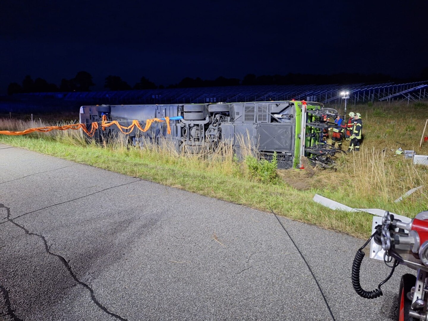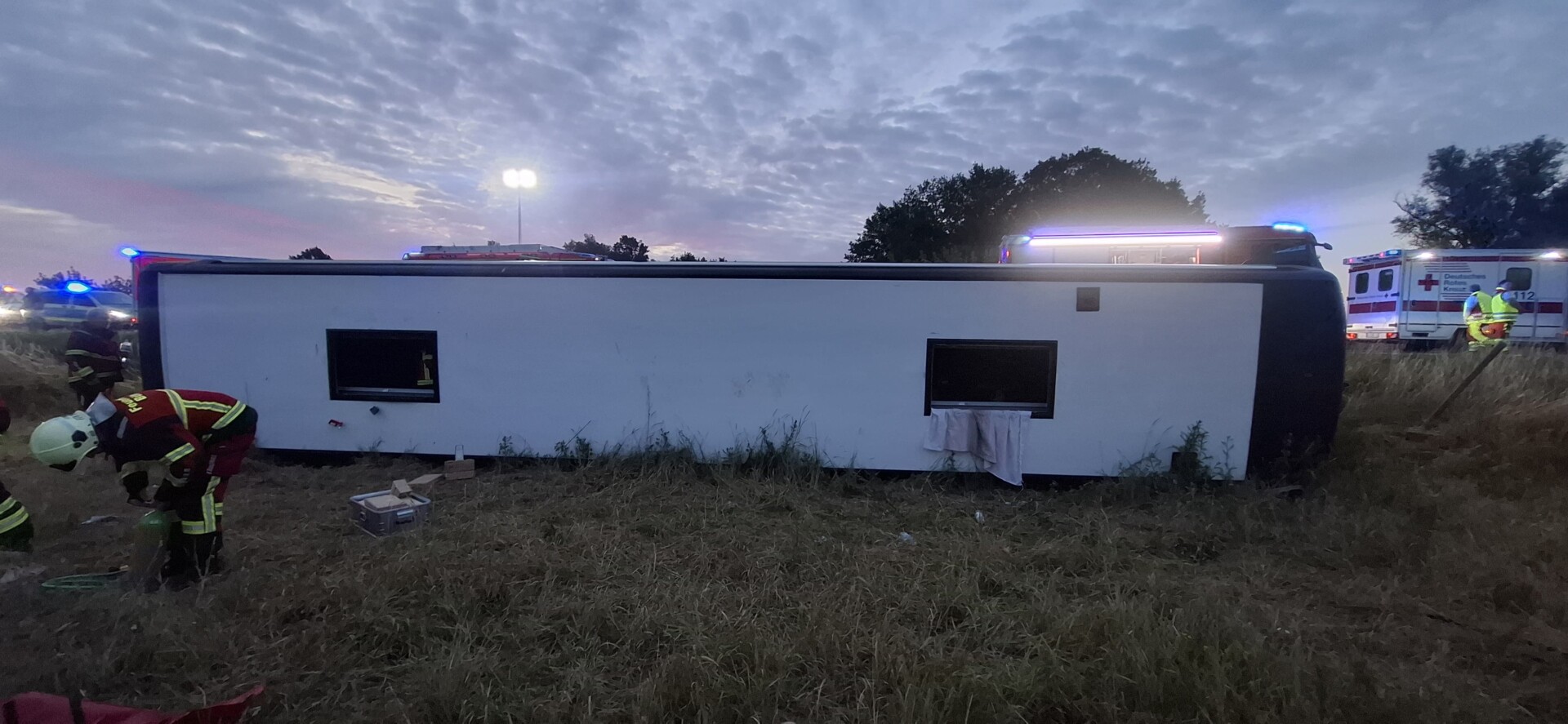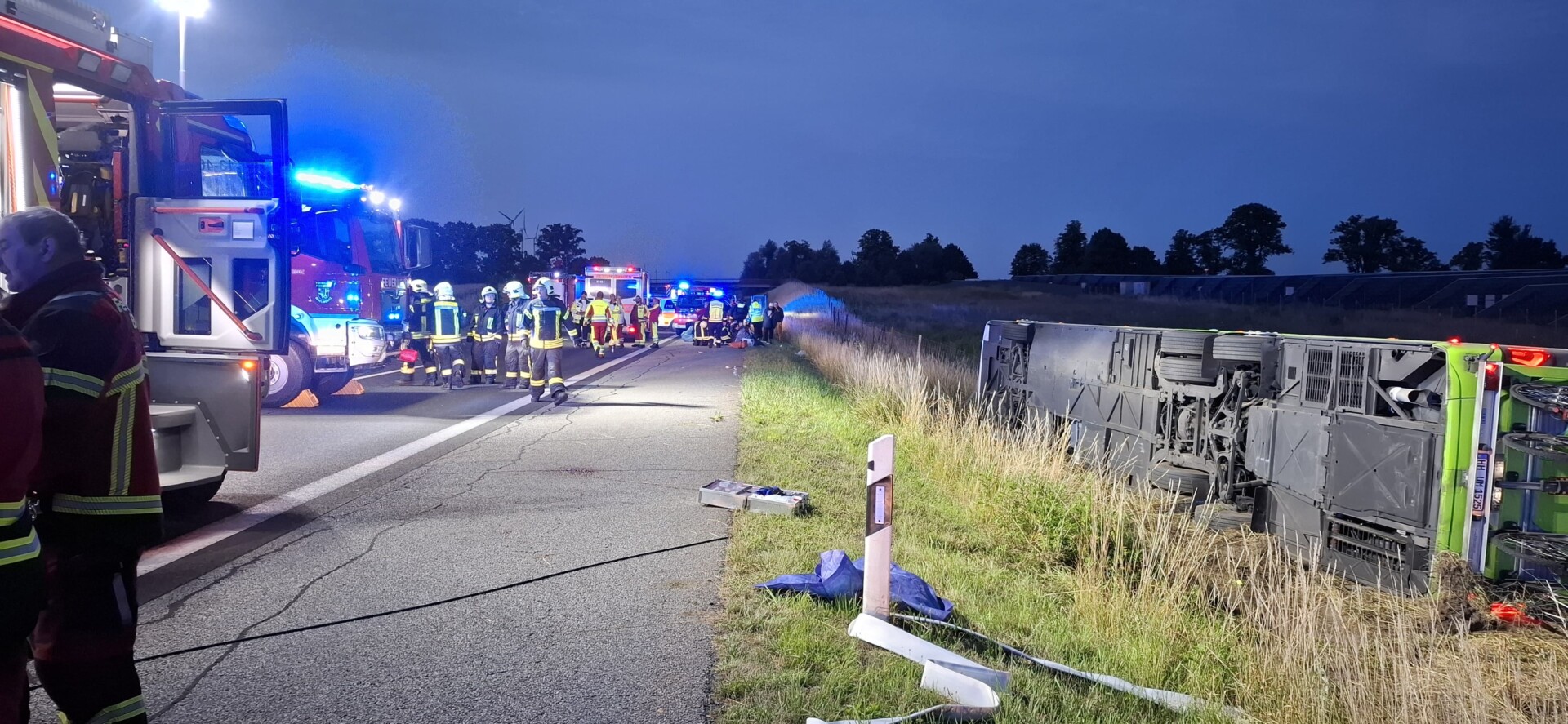 Schweres Busunglück heute früh gegen 2.40 Uhr auf der A 19 bei Röbel: Aus bislang ungeklärter Ursache kam kurz hinter der Anschlussstelle Röbel Richtung Berlin ein Flixbus nach rechts von der Fahrbahn ab und kippte auf die Seite. Der Bus, der die Linie Kopenhagen – Wien bedient, war nach derzeitigem Stand mit 53 Reisenden und zwei Busfahrern besetzt. Insgesamt wurden nach jetzigem Informationen 20 Reisende verletzt. Einer von ihnen war über zwei Stunden eingeklemmt und musste mit schwerem Gerät befreit werden. Er gilt als schwerstverletzt.