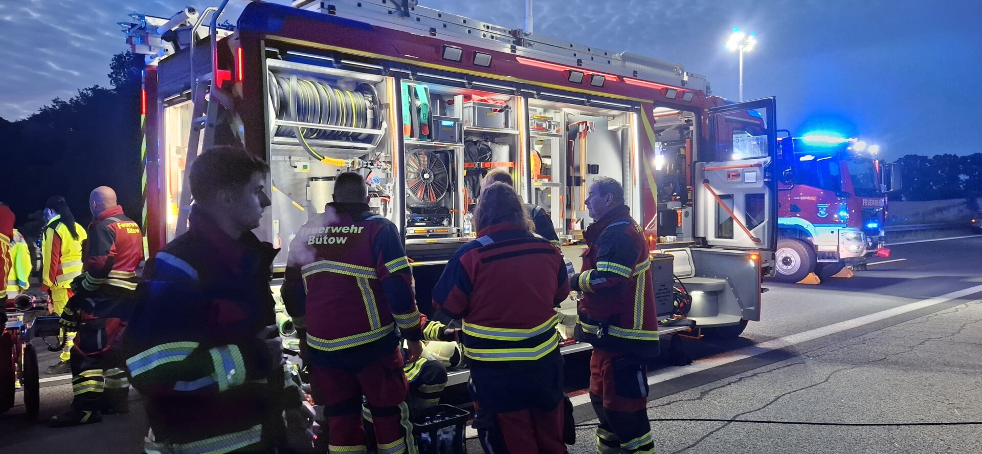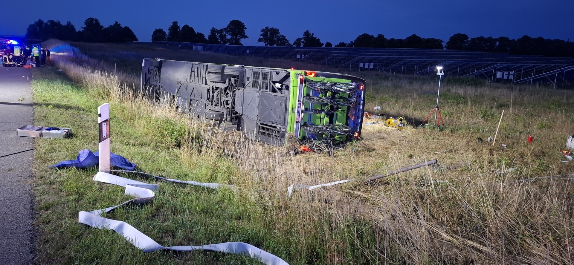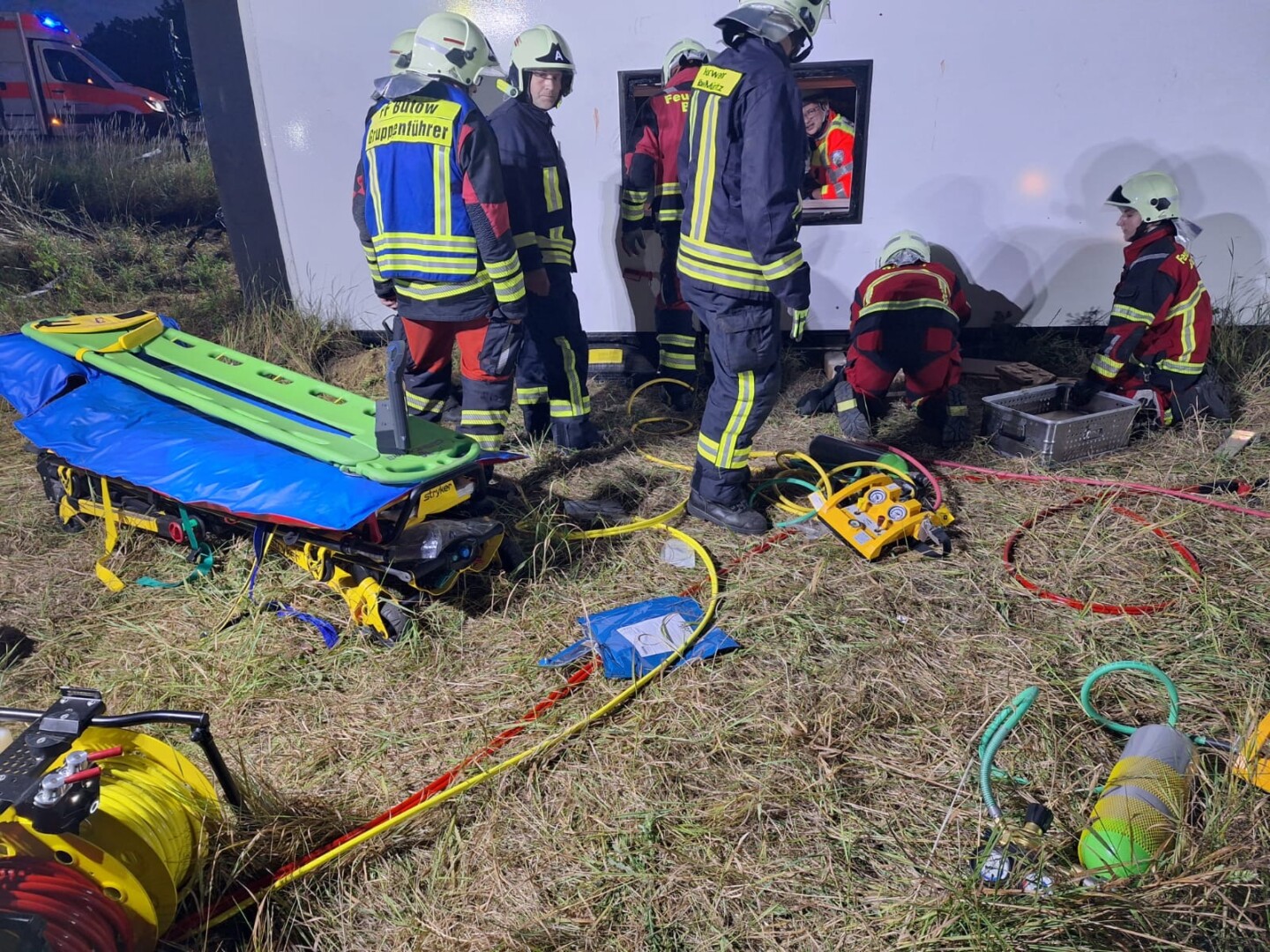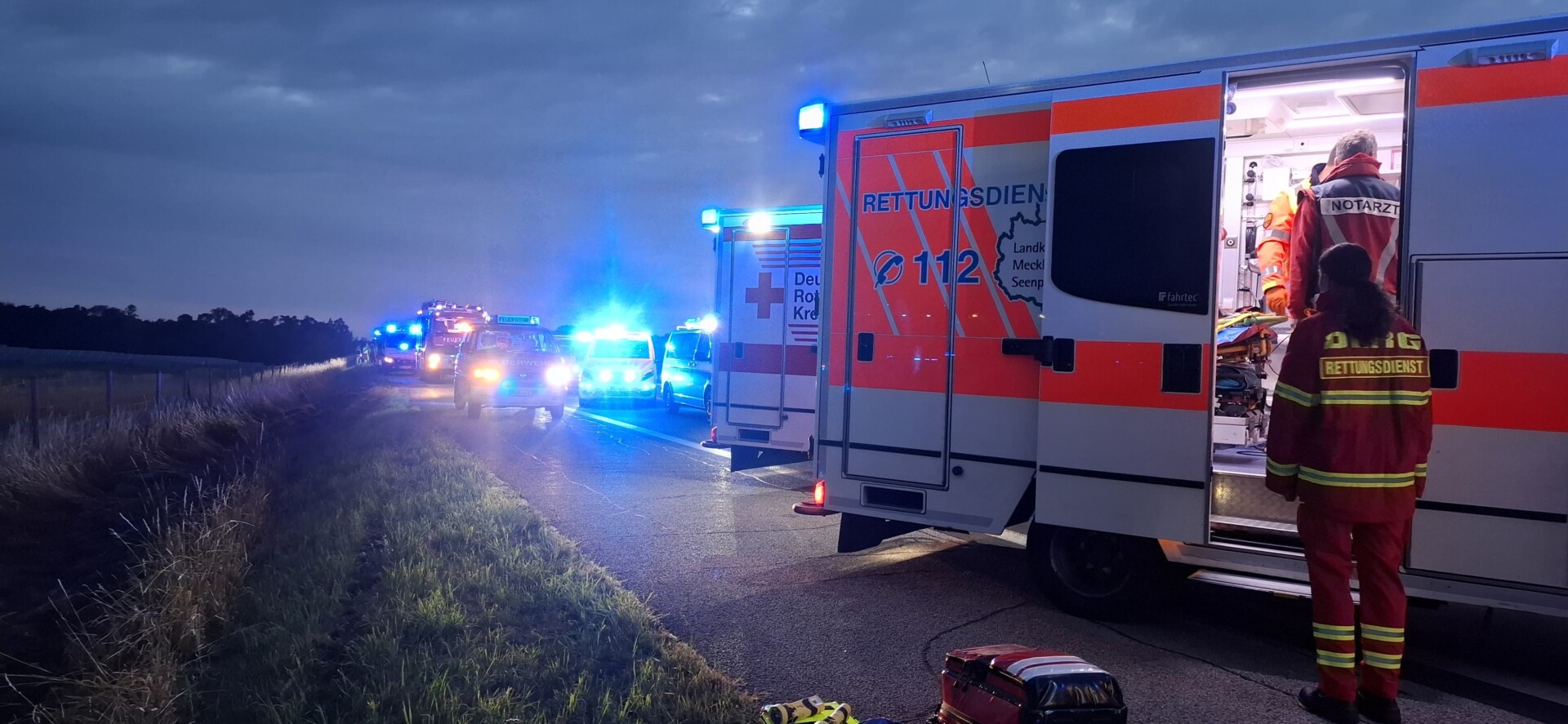 Schweres Busunglück heute früh gegen 2.40 Uhr auf der A 19 bei Röbel: Aus bislang ungeklärter Ursache kam kurz hinter der Anschlussstelle Röbel Richtung Berlin ein Flixbus nach rechts von der Fahrbahn ab und kippte auf die Seite. Der Bus, der die Linie Kopenhagen – Wien bedient, war nach derzeitigem Stand mit 53 Reisenden und zwei Busfahrern besetzt. Insgesamt wurden nach jetzigem Informationen 20 Reisende verletzt. Einer von ihnen war über zwei Stunden eingeklemmt und musste mit schwerem Gerät befreit werden. Er gilt als schwerstverletzt.