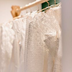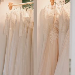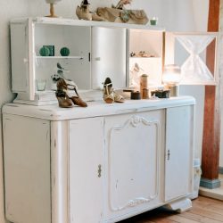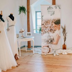 Ihren Geschäftsraum, in dem gut 40 verschiedenen Brautkleider hängen, kann man eigentlich gar nicht als solchen bezeichnen: Alte Dielen, dezentes Licht, eine liebevolle Einrichtung. Man kommt runter. Sofort. Egal, ob man bei Maria nach einem Brautkleid Ausschau hält oder sie einfach nur so besucht. Ihre Räume strahlen eine Atmosphäre aus, die Stress und Hektik vergessen lassen – ein alter Buffet-Schrank, den sie in Röbel erstanden und aufgearbeitet hat, ein Nähtisch mit Geschichte von ihrer Oma und Farben, die beruhigen. Hier passt einfach alles, hier fühlen sich Besucher und vor allem die künftigen Bräute wohl.