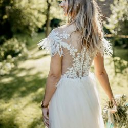„So kann ich bei Bedarf auch noch mehr rund um eine schöne Hochzeit organisieren“, sagt Maria Saß, die bei ihrem nebenberuflichen Geschäft voll und ganz auf die Unterstützung ihres Mannes André setzen kann. Der modelt auch schon mal zusammen mit ihren Freundinnen, die gerne ihre besondere Brautmode präsentieren. Der Park am Gutshaus bietet sich da als Kulisse hervorragend an. Und ihre Mode passt auch in den Park – sie ist nachhaltig und kann auch nach dem schönsten Tag im Leben einer Frau getragen werden. Vielleicht mit der einen oder anderen Veränderung. Aber ein Kleid von „Tannengrün“ ist kein Kleid, das jahrelang im Schrank verstaubt. Es lebt weiter.