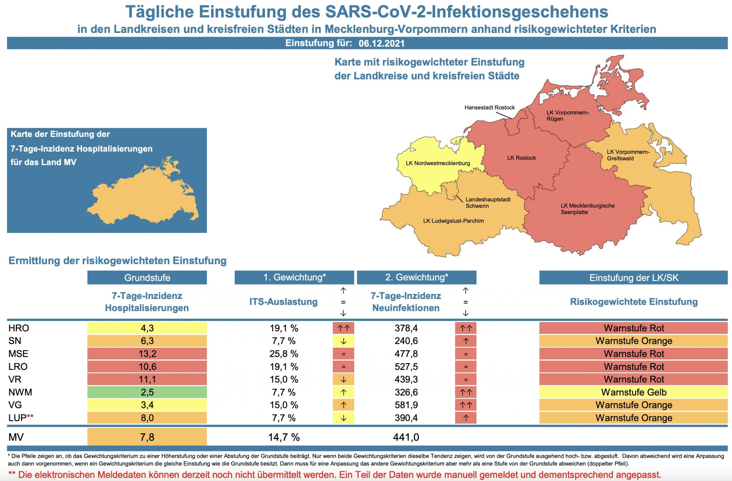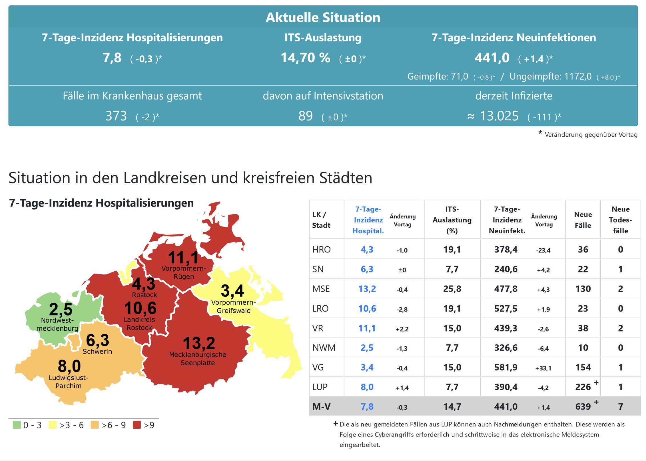Die Hospitalisierung in ganz Mecklenburg-Vorpommern sinkt von 8,0 auf 7,8. Die Inzidenz des Landes steigt von 440,2 auf 441. Das Land Mecklenburg-Vorpommern meldet heute 639 Neuinfektionen und sieben neue Todesfälle.