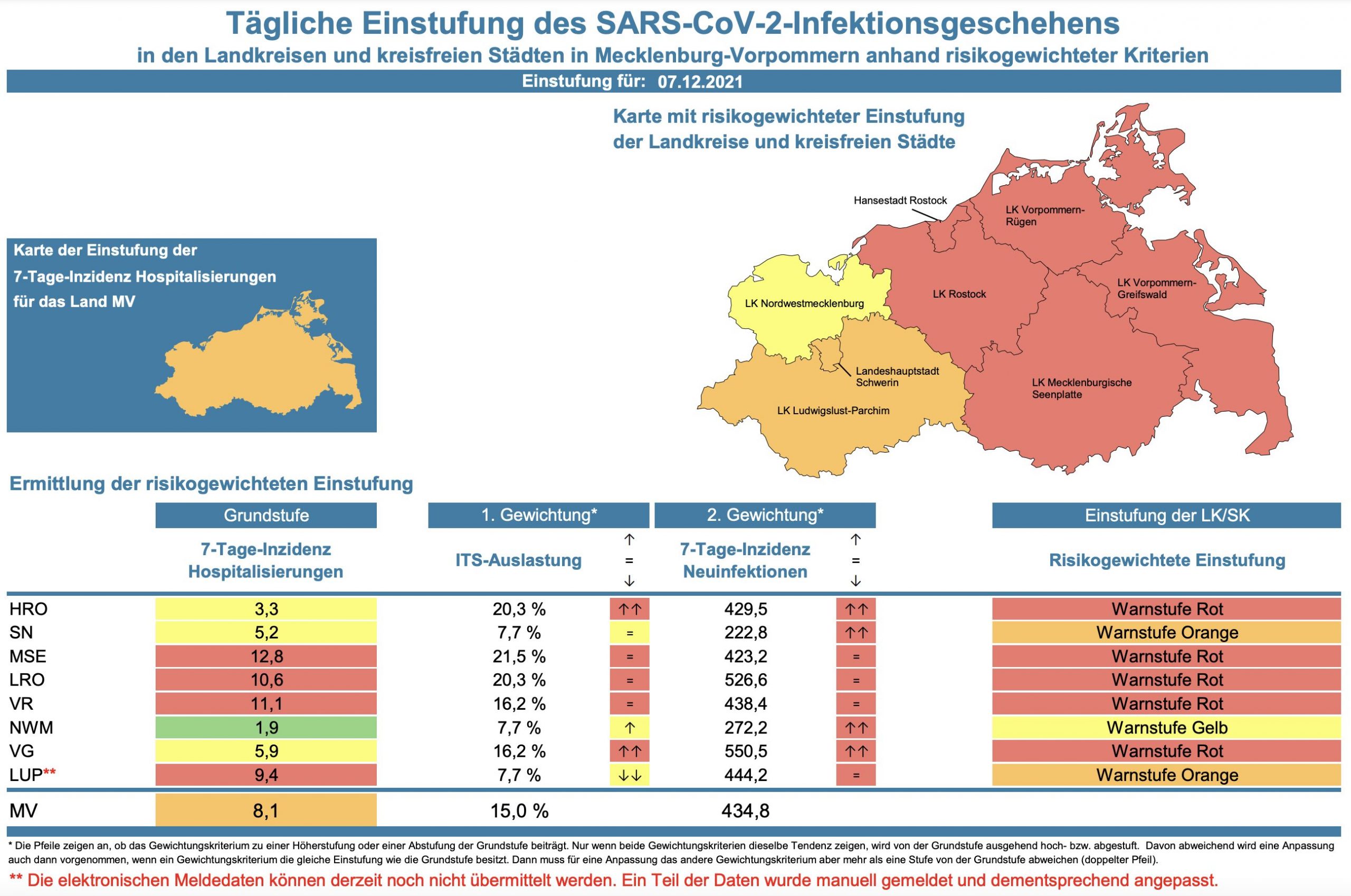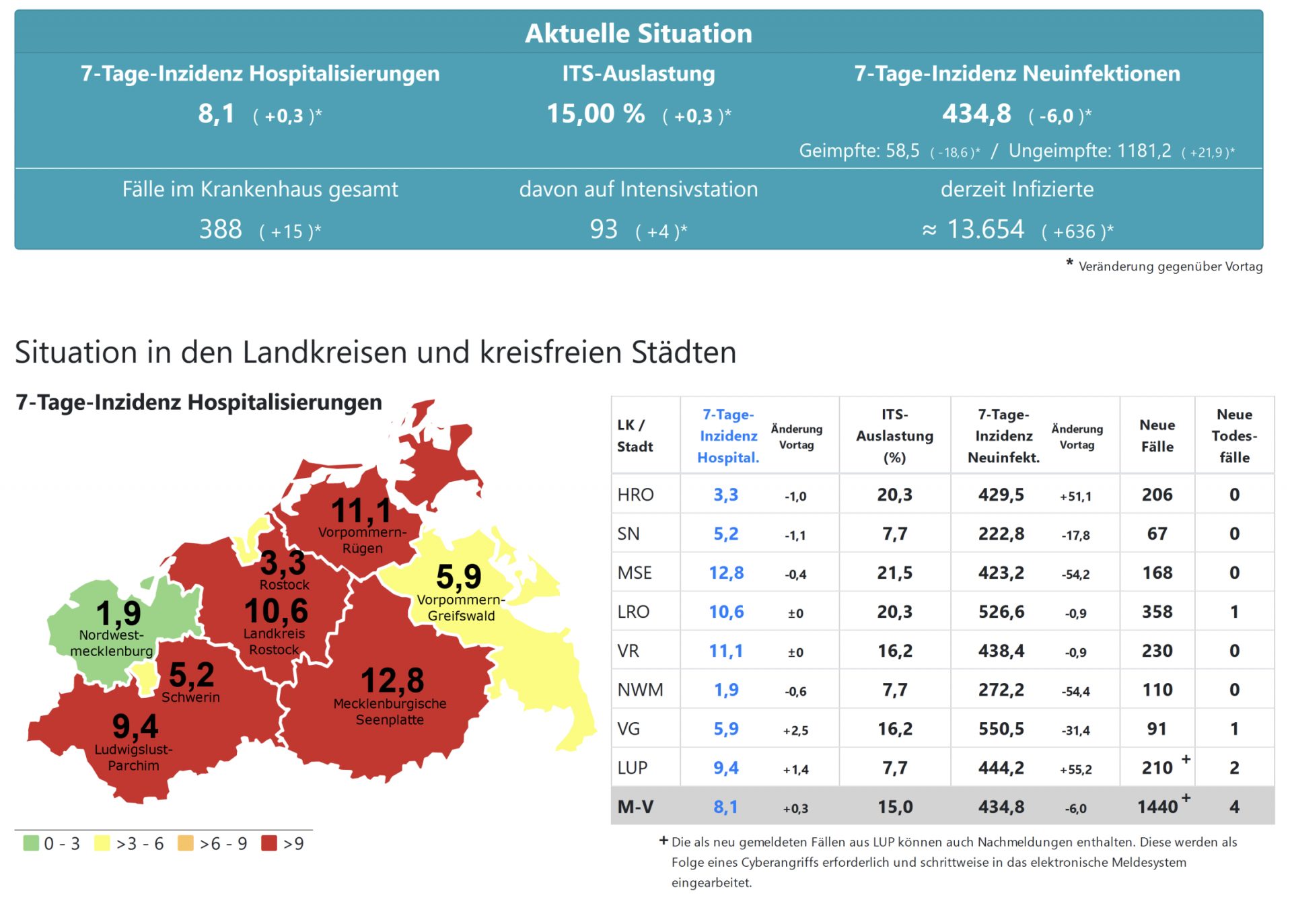 Die Hospitalisierung in ganz Mecklenburg-Vorpommern steigt von 7,8 auf 8,1. Die Inzidenz des Landes sinkt von 441 auf 434,8. Das Land Mecklenburg-Vorpommern meldet heute 1440 Neuinfektionen und vier neue Todesfälle.