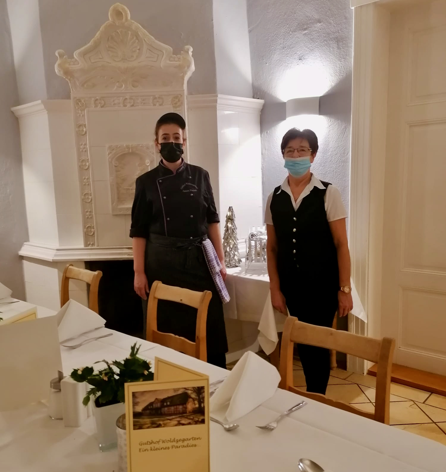 Foto im Text: Küchenchefin Annett Puchelt und Servicemitarbeiterin Rita Eschler bedienen an diesem Wochenende ihre letzten Gäste im Gutshaus Woldzegarten.
