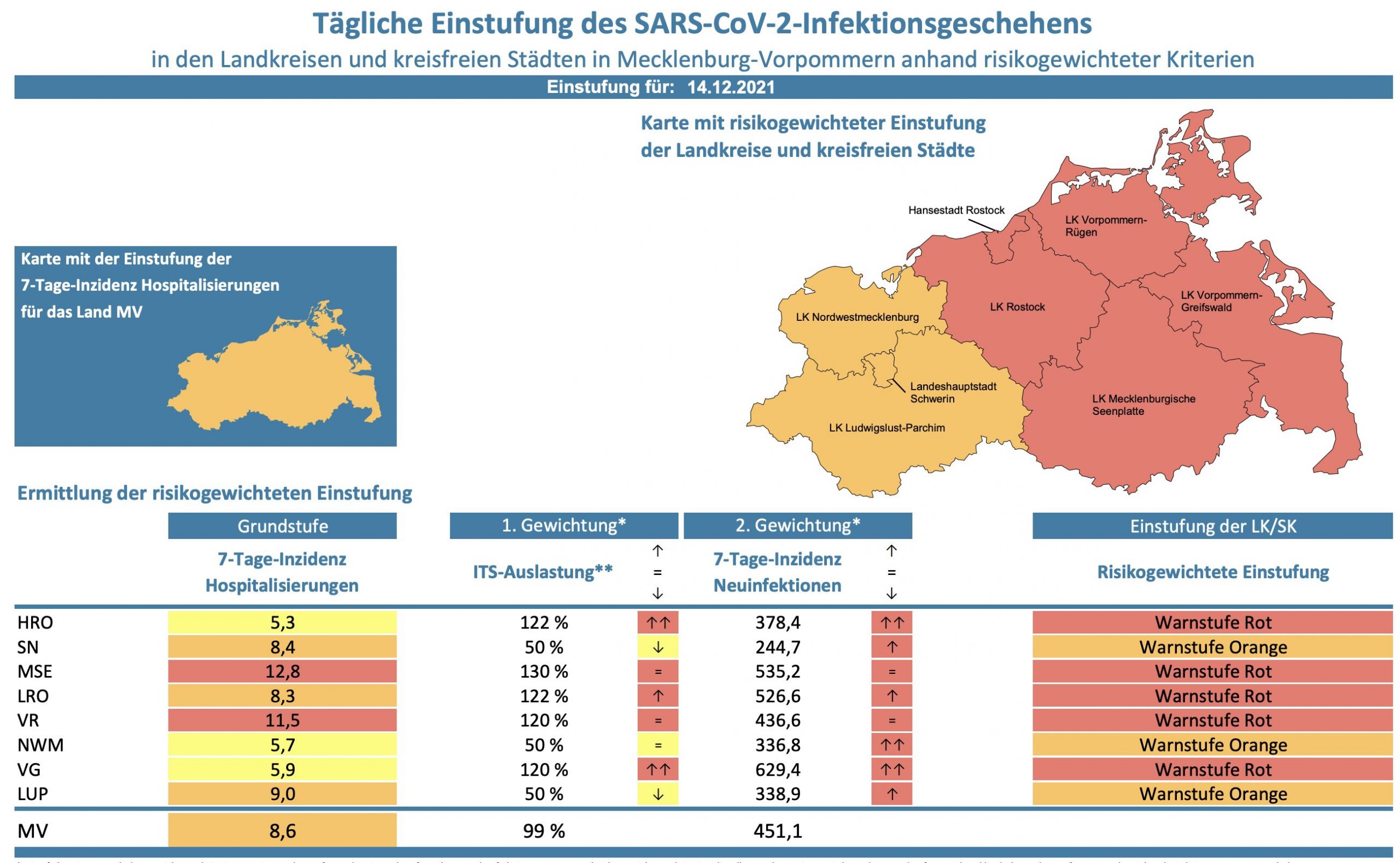 Die Hospitalisierung in ganz Mecklenburg-Vorpommern steigt von 8,1 auf 8,6, die Inzidenz des Landes steigt von 432,5 auf 451,1. Das Land Mecklenburg-Vorpommern meldet heute 1934 Neuinfektionen und 11 Todesfälle.