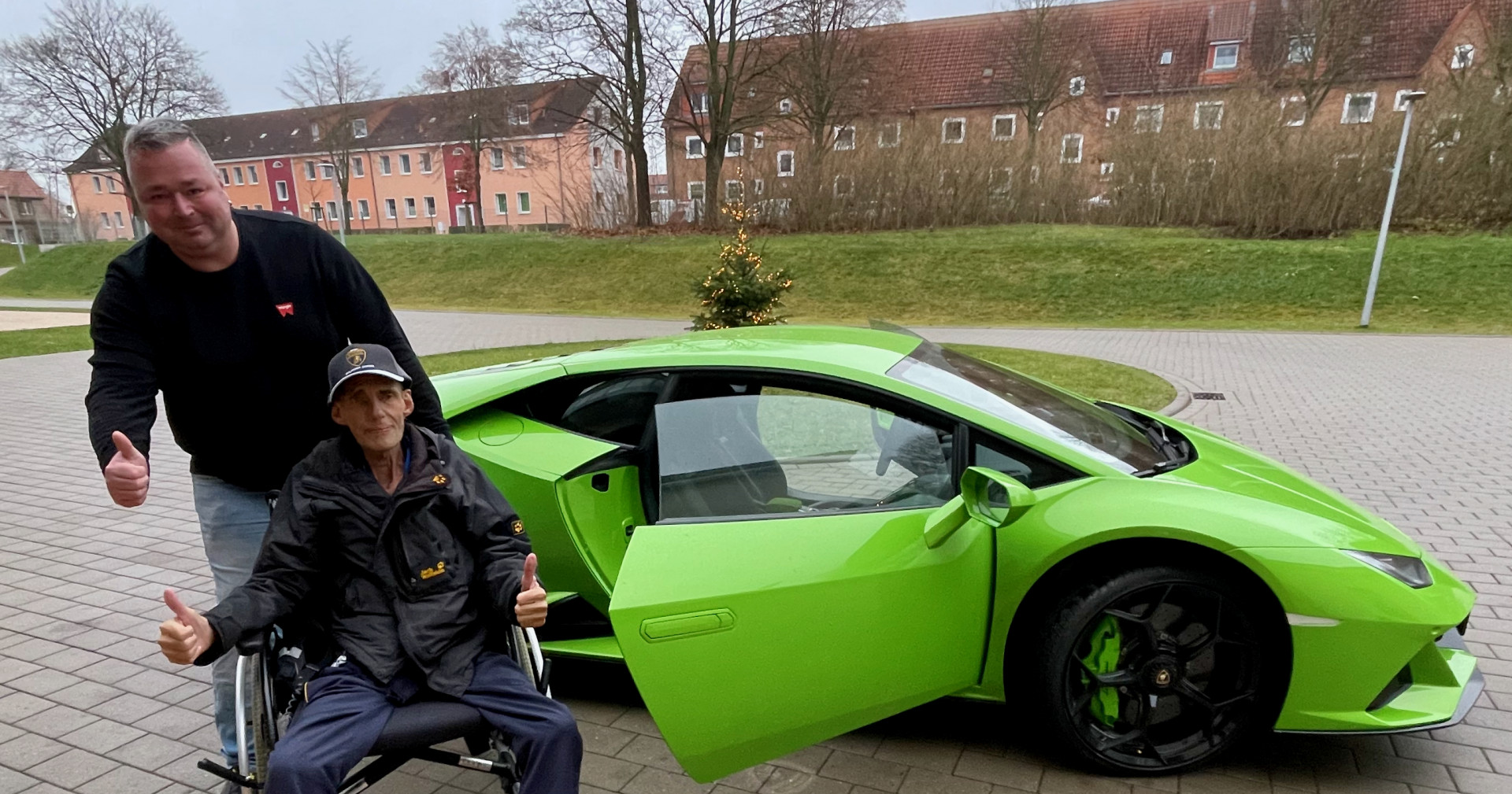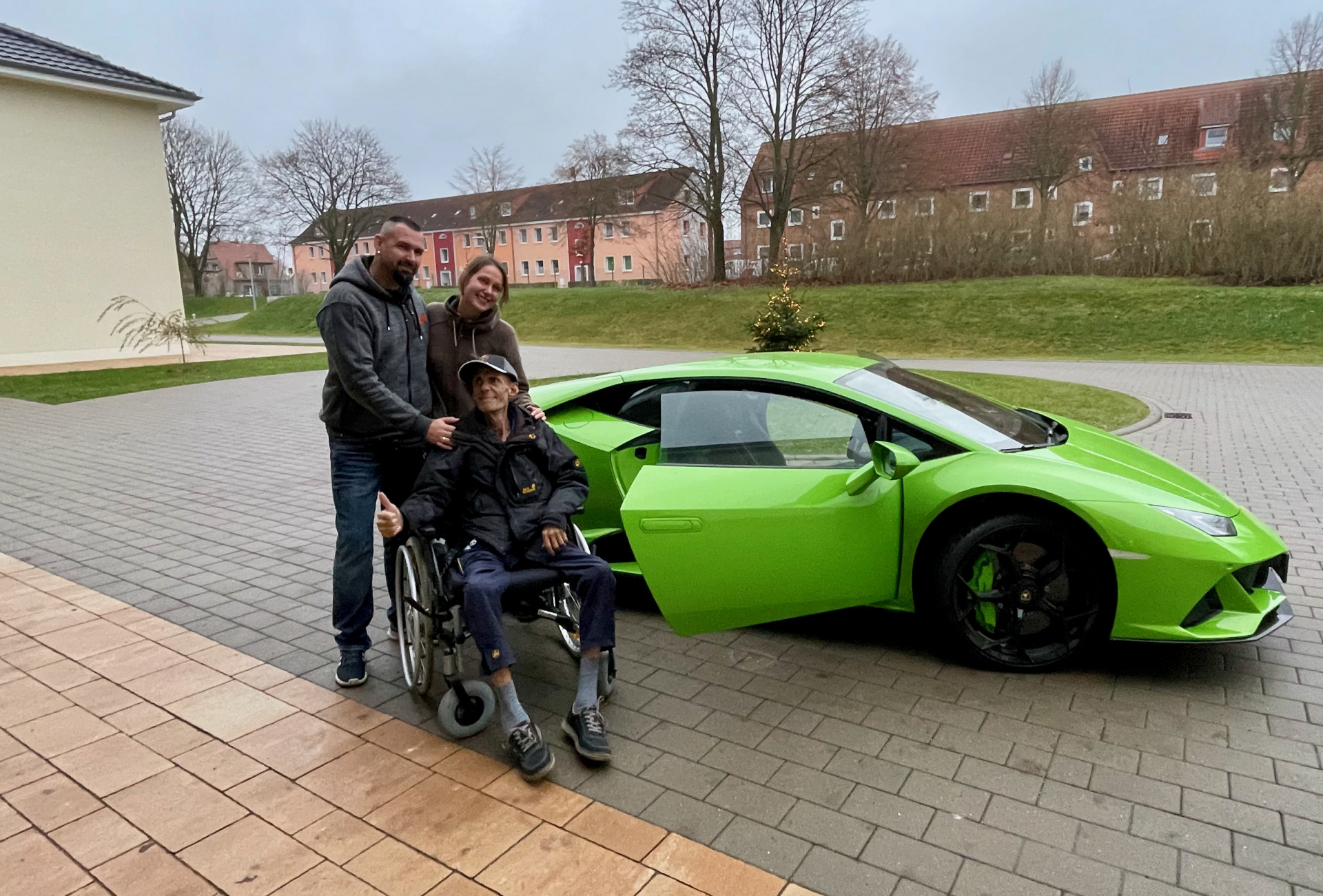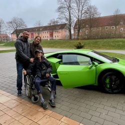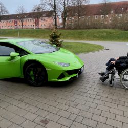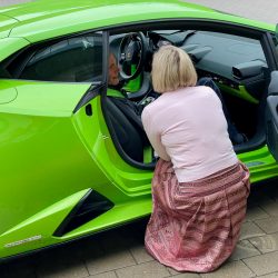 Dann beginnt eine Geschichte, die unter der Überschrift stehen könnte: „Es ist immer gut, wenn man jemanden kennt, der einen kennt, der einen anderen kennt…“ Und so erfuhr irgendwann Susanne Kühne vom Warener VW-Autohaus Kühne von dem Wunsch des kranken Mannes und hatte auch gleich eine Idee. Sie rief ihren Geschäftspartner Lars Pohlmann aus Mirow an und der wusste, wer einen tollen Lamborghini besitzt: Matthias Krumm aus Mirow. Matthias zögerte ebenfalls nicht lange und sagte – ohne lange zu überlegen – zu – obwohl auch sein grüner „Liebling“ schon winterfest in der Garage stand. Ein Termin wurde vereinbart. Doch dann gab es ein unerwartetes Problem: Schnee. So platzte der erste Termin, an dem Jörg überrascht werden sollte. Denn Schnee ist so gar nichts für diese Autos.