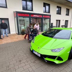 Gestern nun hat’s geklappt. Matthias Krumm und Lars Pohlmann standen mit dem auffälligen Auto vor dem Hospiz, und Bewohner Jörg war zu Tränen gerührt. Er konnte es nicht fassen. Als er dann auch noch im Lamborghini sitzen durfte und Matthias mit im losbrauste, konnte der 65-Jährige für einen Moment seine schlimme Krankheit vergessen. Während der Tour nach Vielist, forderte er Matthias sogar auf, doch mal kräftiger aufs Gaspedal zu drücken. Die Fahrt hat ihm so gut gefallen, dass er gar nicht wieder aussteigen wollte und voller Begeisterung immer wieder den Sitz streichelte. „Das ist so geil. Und Ihr alle auch“, sagte er und ließ sich noch einmal um das ganze Auto herum schieben. „Das ist schon ein ganz schönes Geschoss, aber die größten Geschosse seid Ihr“, freute sich der Hospiz-Gast, und erzählte zugleich, wie dankbar er sei, in der DRK-Einrichtung wohnen zu dürfen. Als ihm Matthias Krumm dann auch noch ein Original-Lamborghini-Basecap auf den Kopf setzte, war der studierte Sozialpädagoge total aus dem Häuschen. Das, so meinte er, nimmt er jetzt nicht mehr ab, auch nicht im Bett.