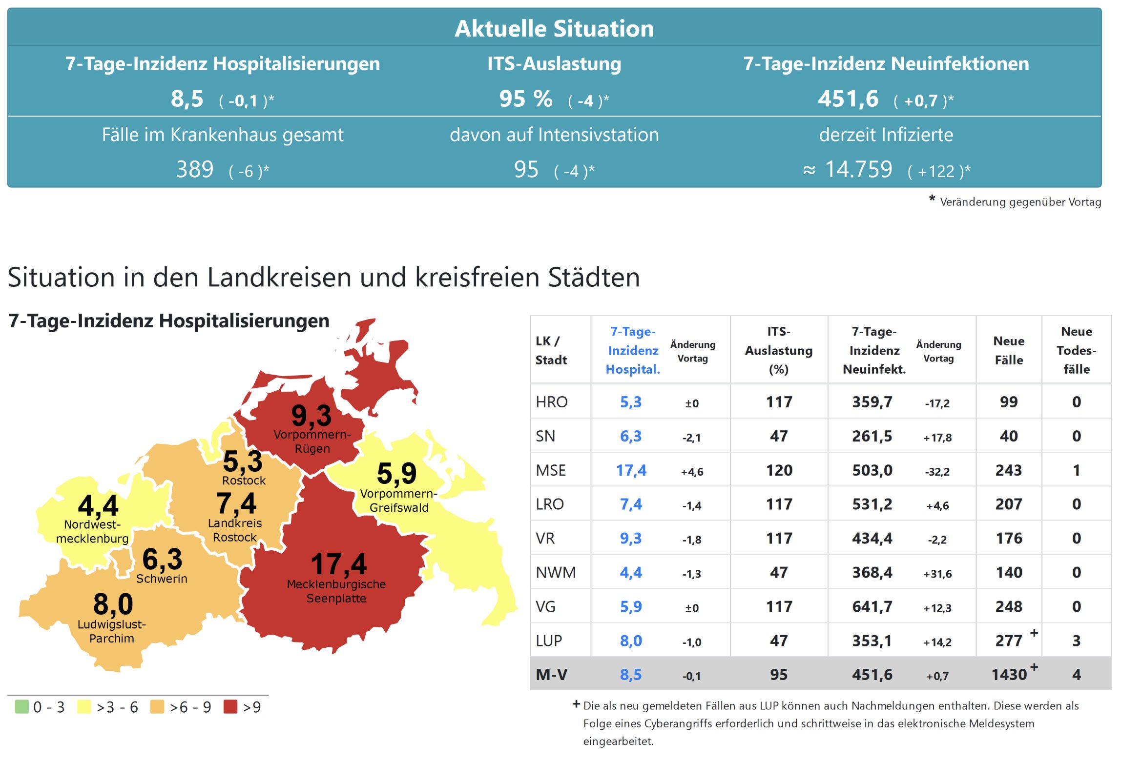 Die Hospitalisierung in ganz Mecklenburg-Vorpommern sinkt minimal von 8,6 auf 8,5, die Inzidenz des Landes steigt von 451,1 auf 451,6. Das Land Mecklenburg-Vorpommern meldet heute 1430 Neuinfektionen und vier neue Todesfälle.