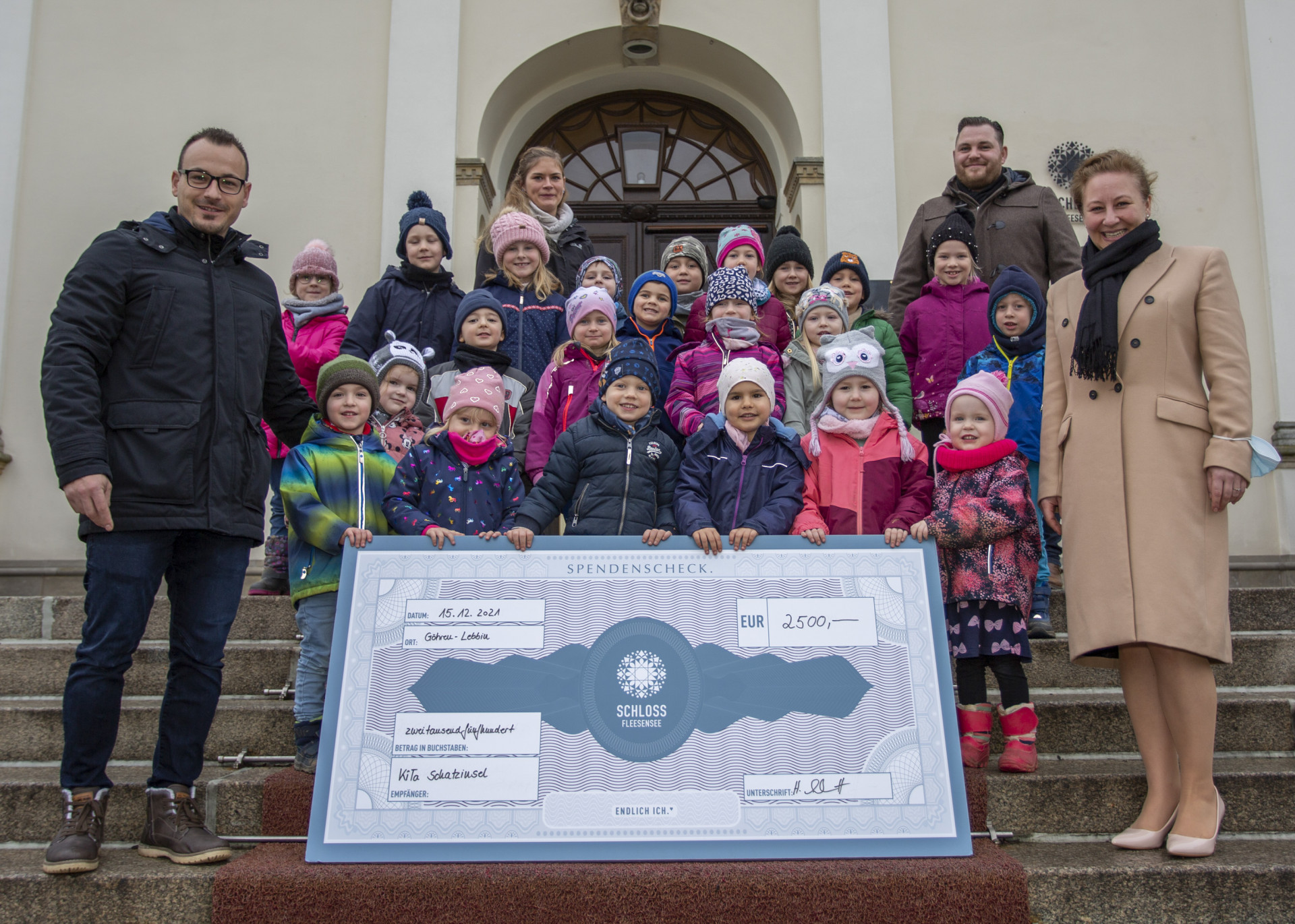 Die Kindertagesstätte „Schatzinsel“ in Göhren-Lebbin erhält 2.500 Euro, die Leiter André Groenke mit seinen Mädchen und Jungen ebenfalls persönlich am Schloss abholte. Das Geld soll zur Errichtung eines Bauwagens für die Kinder verwendet werden.