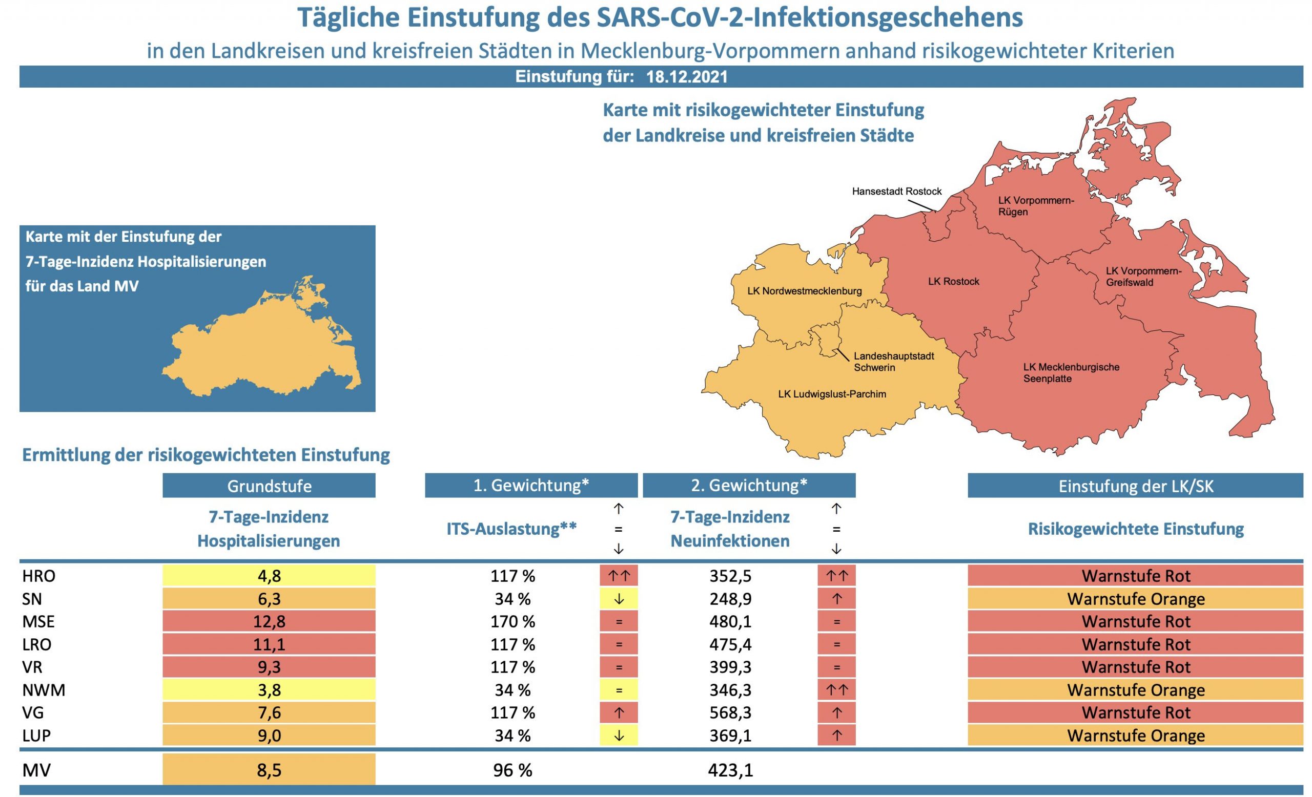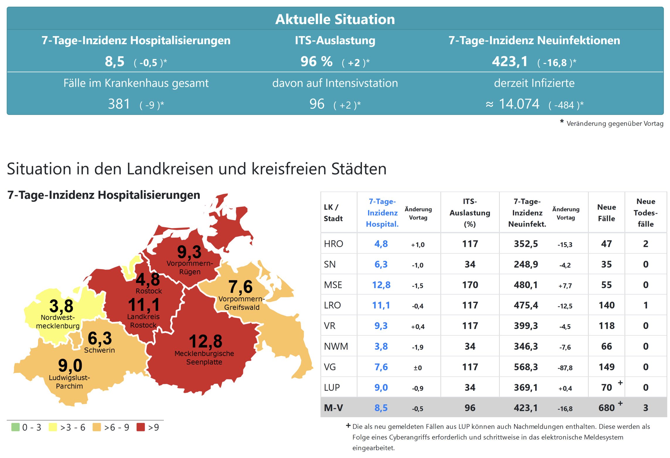 Die Hospitalisierung in ganz Mecklenburg-Vorpommern sinkt minimal von 9,0 auf 8,5, die Inzidenz des Landes von 440,2 auf 423,1. Das Land Mecklenburg-Vorpommern meldet heute 680 Neuinfektionen und drei neue Todesfälle.