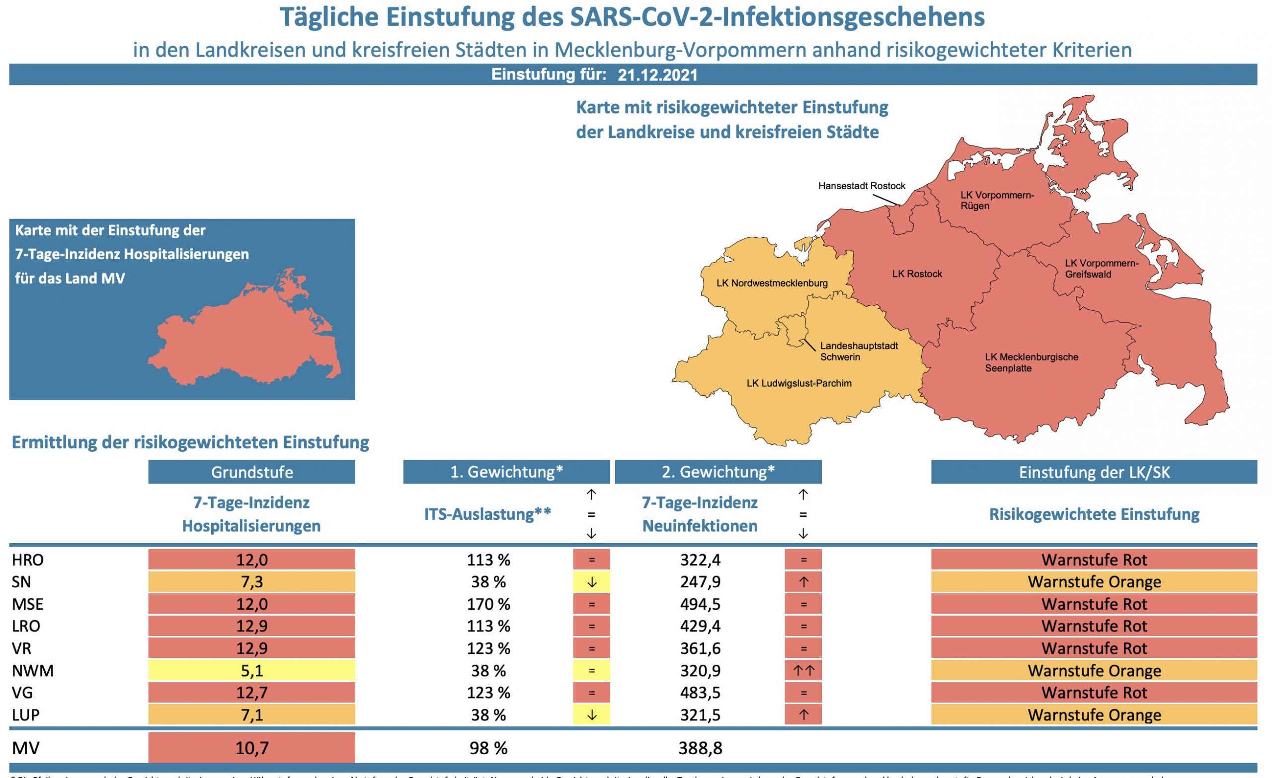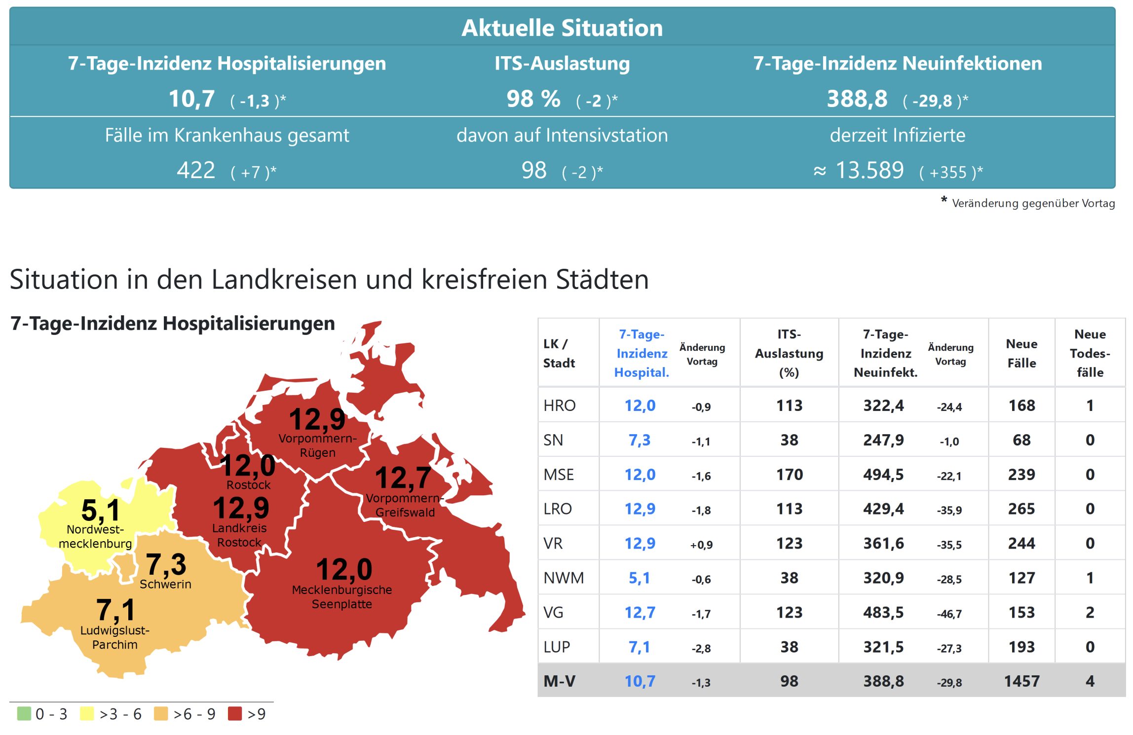 Die Hospitalisierung in ganz Mecklenburg-Vorpommern liegt jetzt bei 10,7, die Inzidenz des Landes sinkt von 418,9 auf 388,8. Das Land Mecklenburg-Vorpommern meldet heute 1457 Neuinfektionen und vier neue Todesfälle.