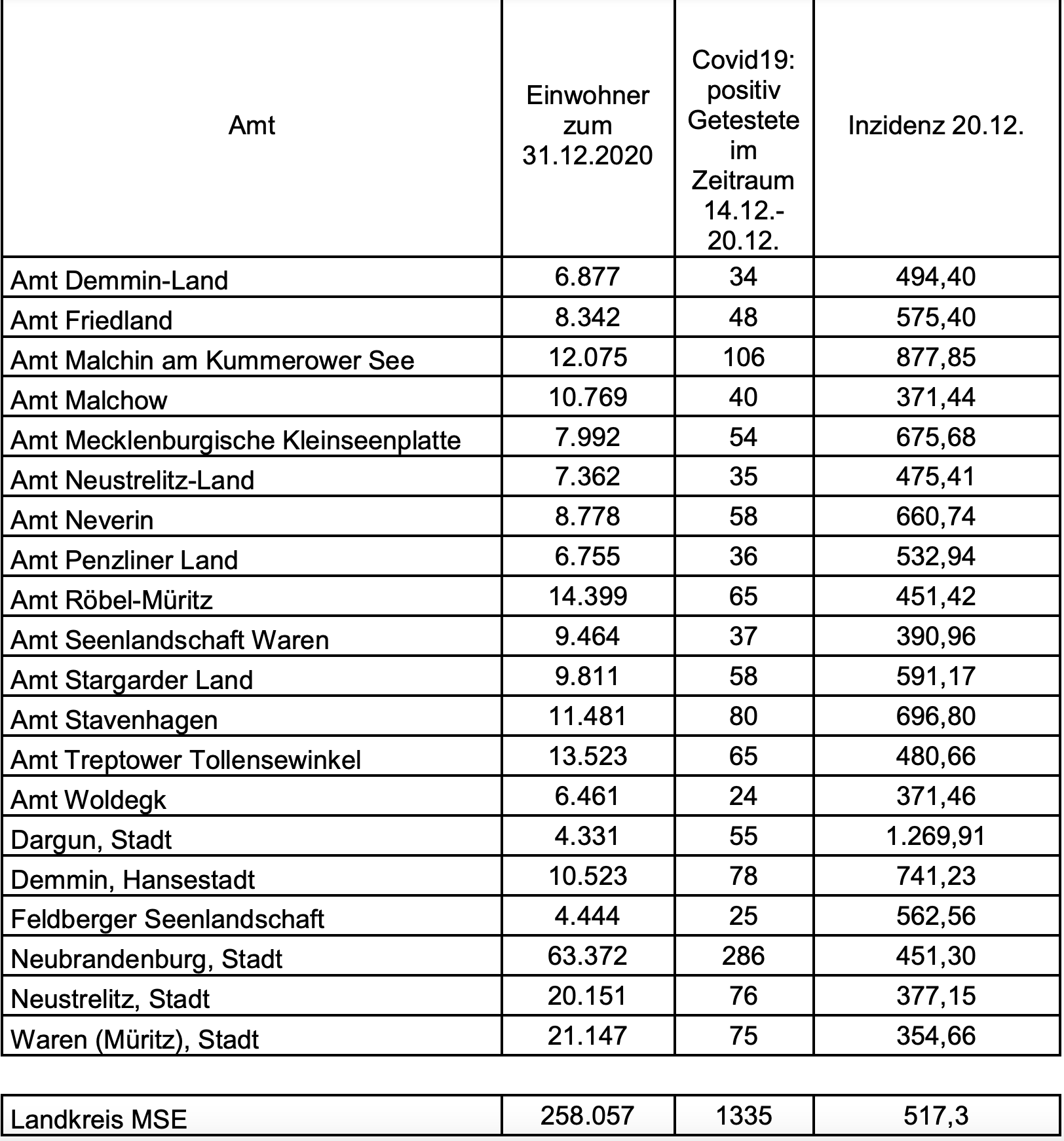 Der Landkreis Mecklenburgische Seenplatte hat heute wieder die einzelnen Inzidenzwerte für die Städte und Ämter veröffentlicht. Danach hat derzeit die Stadt Dargun die höchste Inzidenz im Kreis, und zwar 1269,91. In Waren liegt sie bei 354,66, im Amt Seenlandschaft Waren bei 532,94, im Amt Malchow bei 371,44, im Amt Penzliner Land bei 532,94 und im Amt Röbel-Müritz bei 451,42.