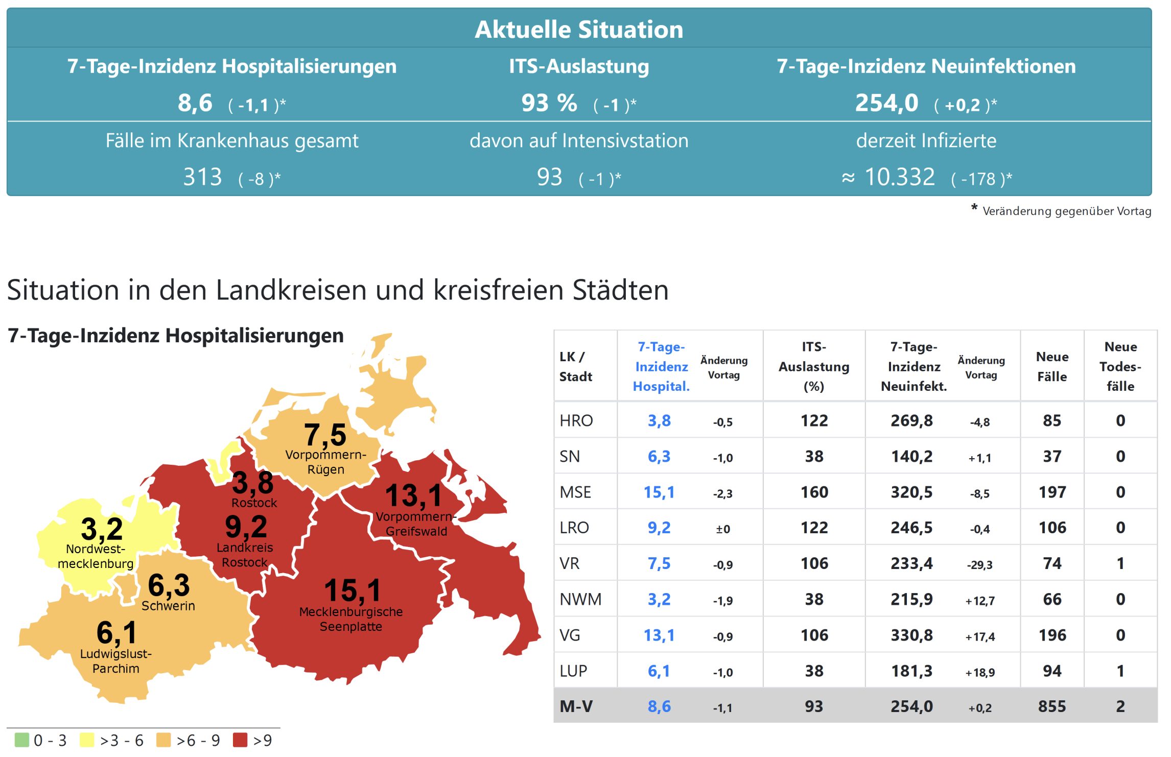 Die Hospitalisierung in ganz Mecklenburg-Vorpommern liegt heute bei 8,6, die Inzidenz des Landes bei 254. Das Land Mecklenburg-Vorpommern meldet heute 855 Neuinfektionen und 2 neue Todesfälle.