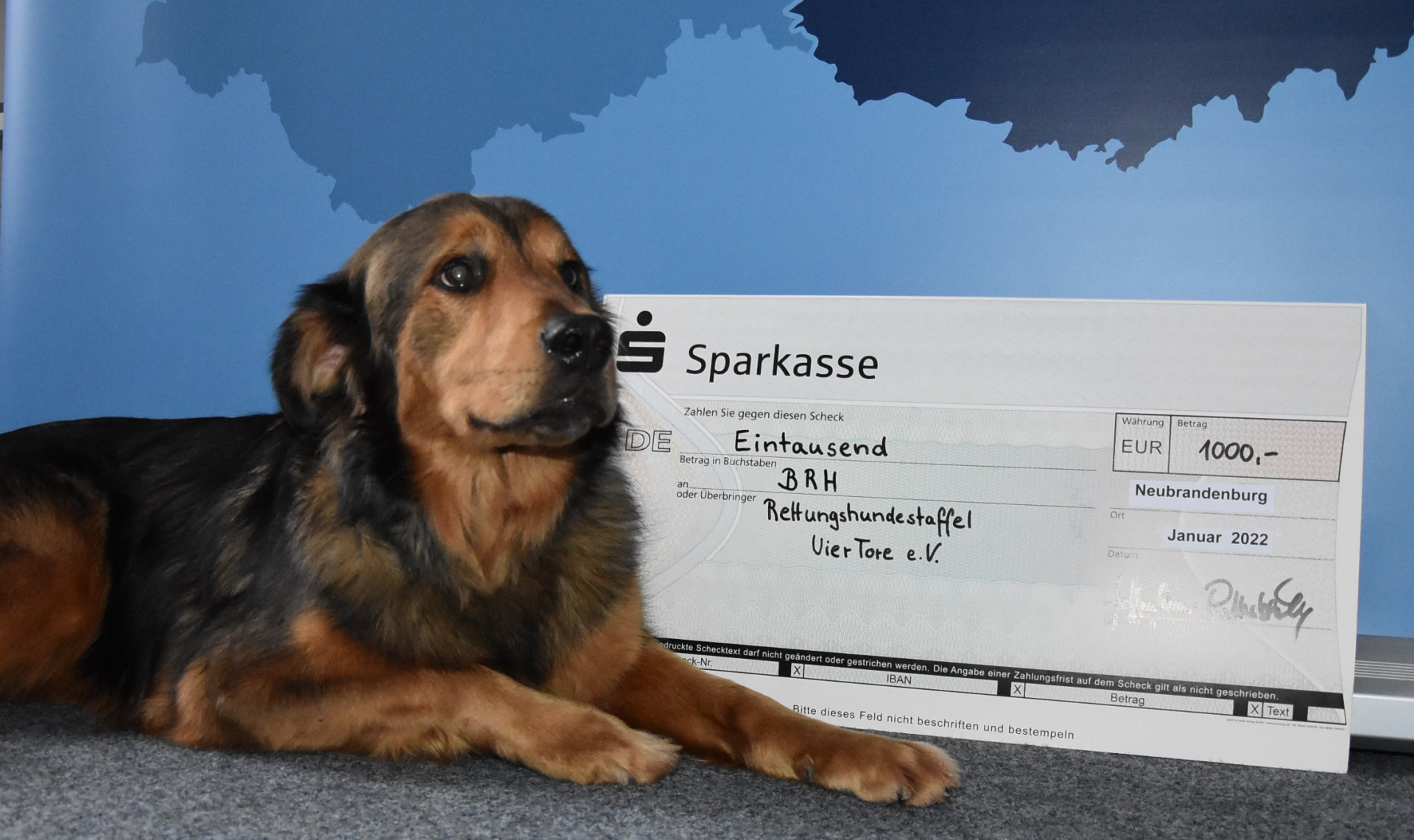 Die Rettungshundestaffel Neubrandenburg unterstützt die Polizei etwa 30 Mal im Jahr, zum Beispiel bei der Suche nach vermissten Personen. Ihre Flächensuchhunde sind ein zusätzliches Einsatzmittel und können unabhängig von Fährten- oder Personenspürhunden eingesetzt werden. Vor wenigen Tagen brannte es auf dem Übungsgelände der Rettungshundestaffel Vier Tore e.V. in Neubrandenburg. Dabei wurden ein Unterstand und Ausrüstungsgegenstände der Staffel zerstört. Für die jahrelange Unterstützung konnte das Polizeipräsidium Neubrandenburg nun etwas zurückgeben. Spontan sammelten die Kollegen Spenden und Polizeipräsident Nils Hoffmann-Ritterbusch zog die Summe mit den Erlösen aus dem Benefizkonzert glatt. So konnten die Polizisten heute an Zugführer Gabriel Fibinger und seinen Hund Börge einen Scheck in Höhe von 1000 Euro überreichen.