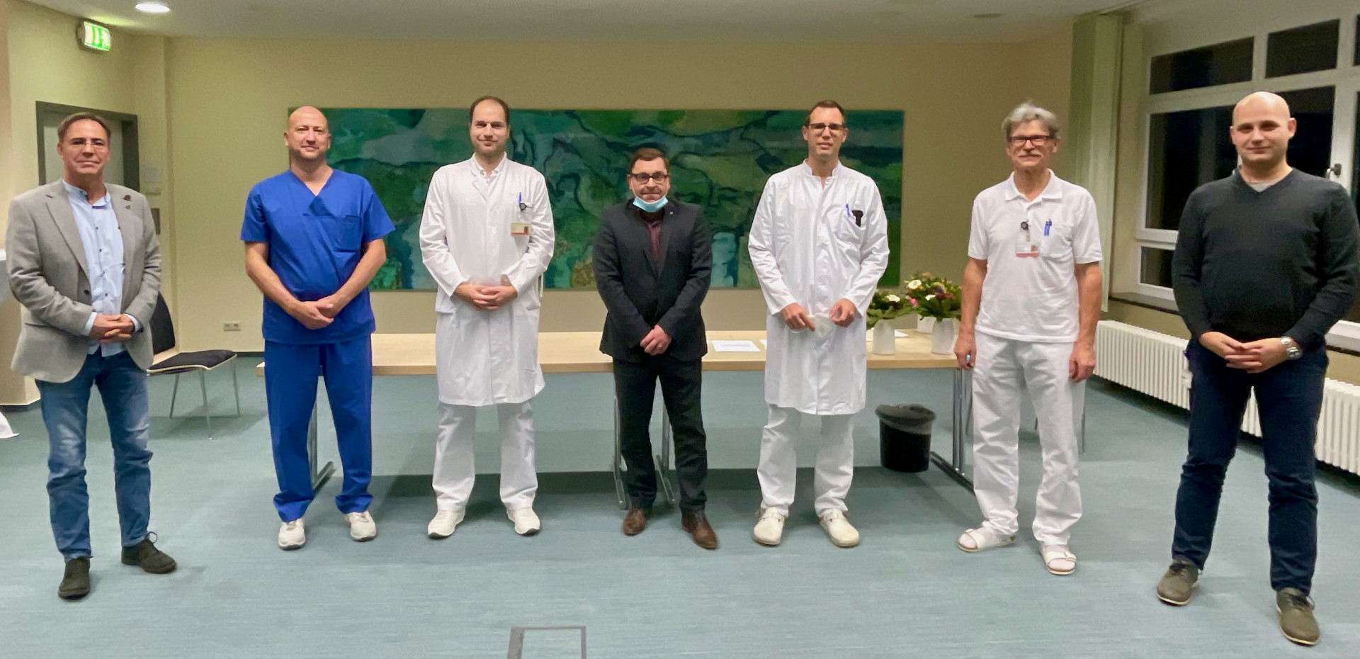 Foto unten: Die Ärztlichen Direktoren Professor Dr. Detlef Kleemann, und Dr. Stefan Bergt, der leitende Urologie-Oberarzt Dr. Markus Rodat, der Kaufmännische Direktor Sven Hendel, Chefarzt Dr. Friedrich Krüger, der leitende Oberarzt Dr. Mario Wuschek und Pflegedirektor Christian Schuster (von links)