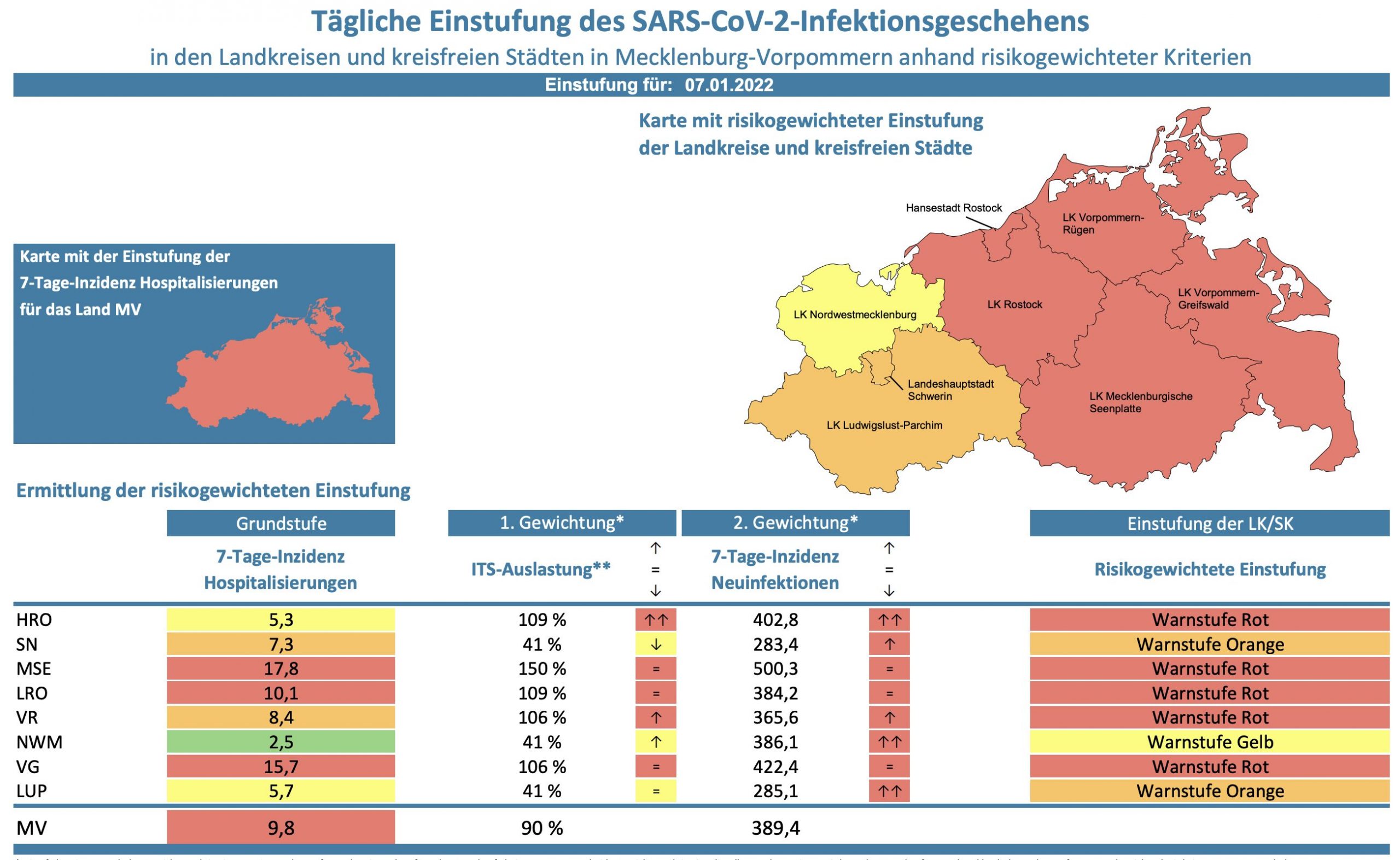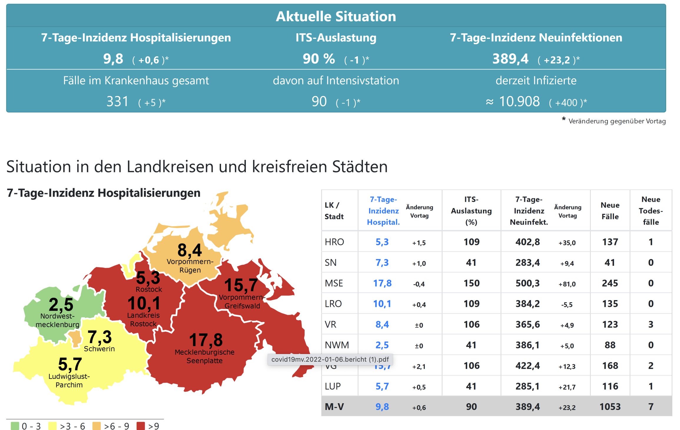 Die Hospitalisierung in ganz Mecklenburg-Vorpommern liegt heute bei 9,8, die Inzidenz des Landes steigt von 367,3 auf 389,4. Das Land Mecklenburg-Vorpommern meldet heute 1053 Neuinfektionen und 7 neue Todesfälle.