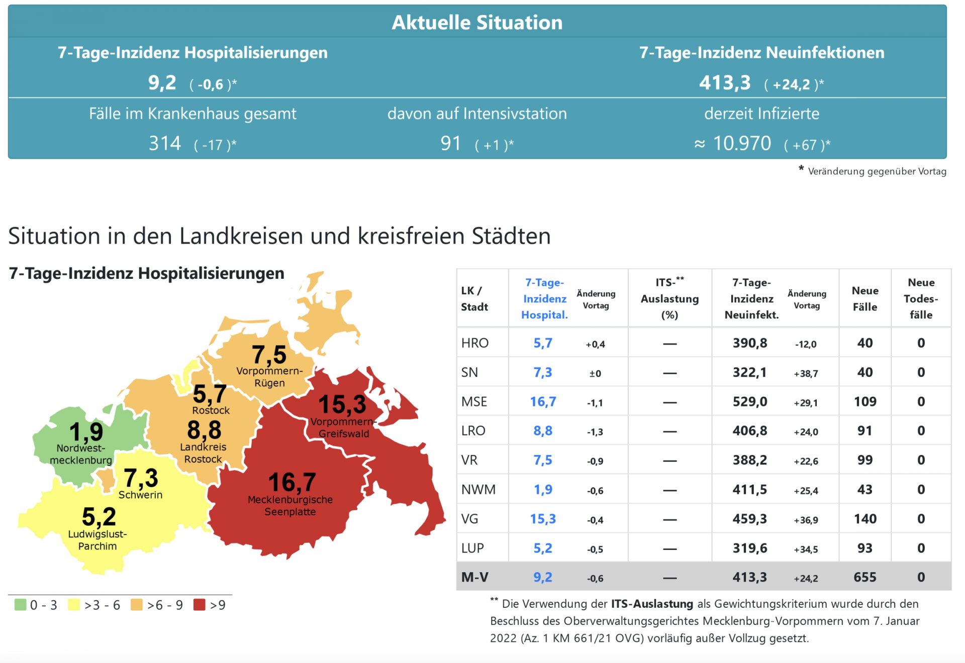 Die Hospitalisierung in ganz Mecklenburg-Vorpommern liegt heute bei 9,2, die Inzidenz des Landes steigt von 389,4 auf 413,3. Das Land Mecklenburg-Vorpommern meldet heute 655 Neuinfektionen und keinen neuen Todesfall.