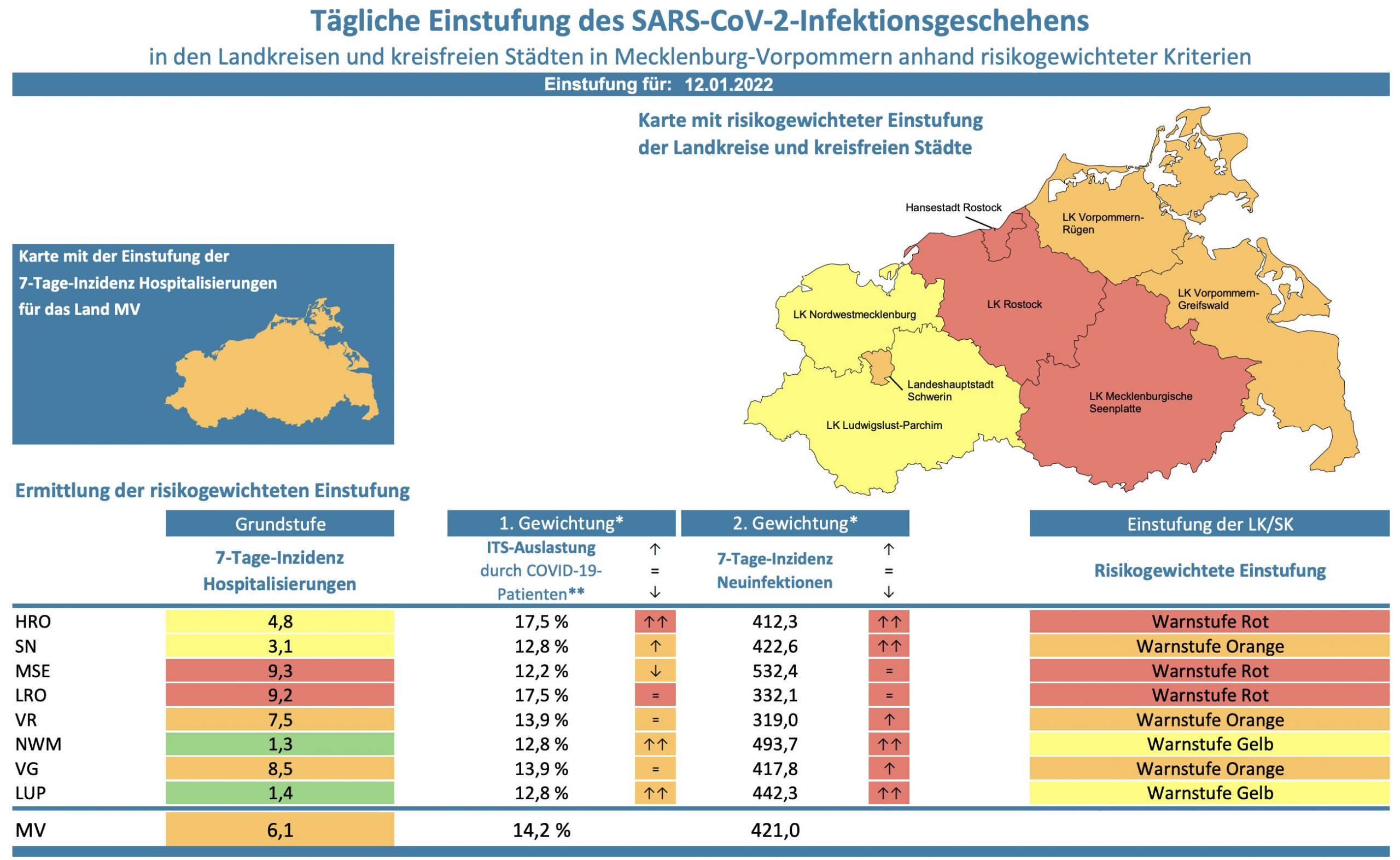 Die Hospitalisierung in ganz Mecklenburg-Vorpommern liegt heute bei 6,1, die Inzidenz des Landes sinkt von 426,0 auf 421. Das Land Mecklenburg-Vorpommern meldet heute 1355 Neuinfektionen und 6 neue Todesfälle.