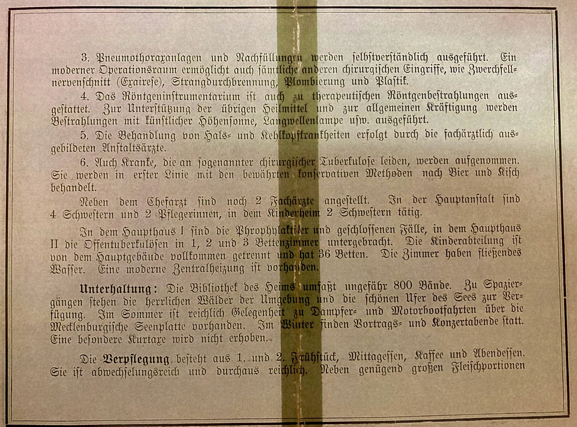 Unterhaltung: Die Bibliothek des Heims umfasst ungefähr 800 Bände. Zu Spaziergängen stehen die herrlichen Wälder der Umgebung und die schönen Ufer des Sees zur Verfügung. Im Sommer ist reichlich Gelegenheit zu Dampfer- und Motorbootfahrten über die Mecklenburgische Seenplatte vorhanden. Im Winter finden Vortrags- und Konzertabende statt. Eine besondere Kurtaxe wird nicht erhoben.