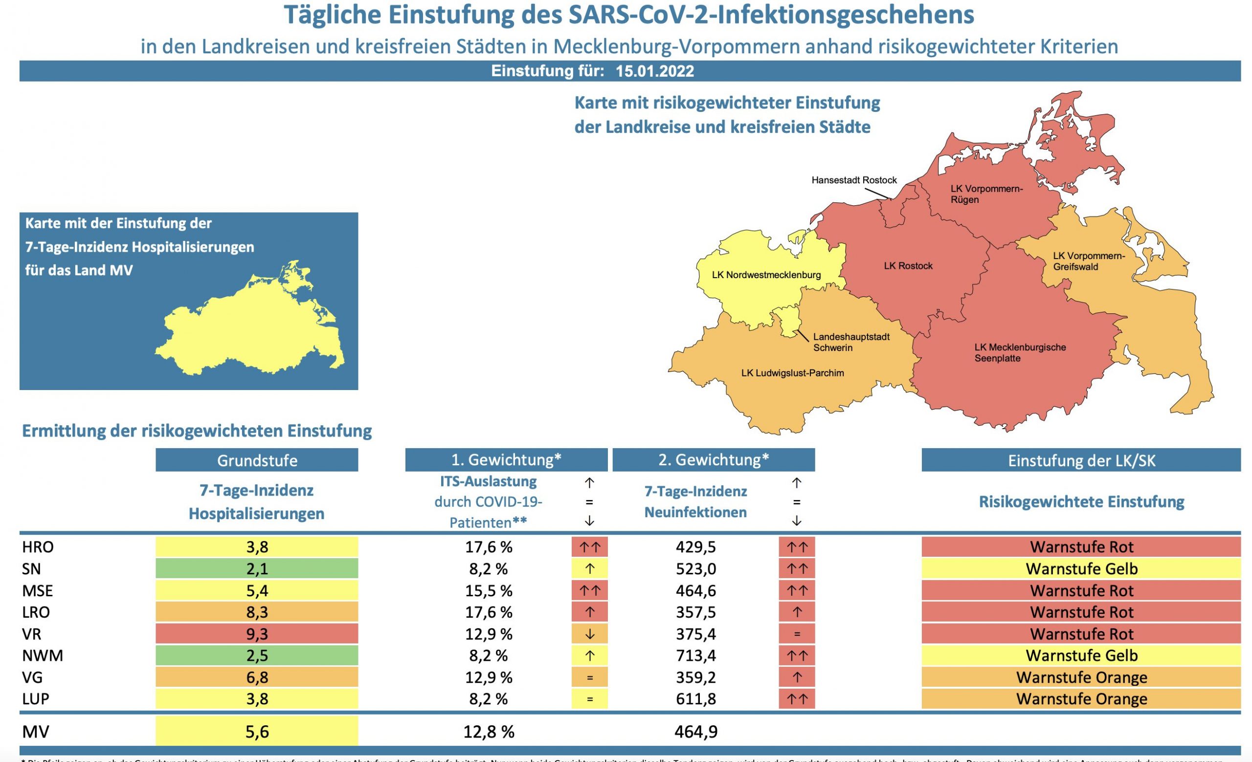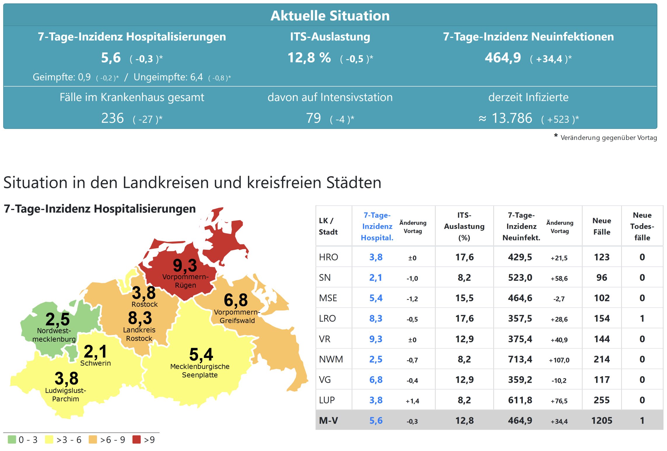 Die Hospitalisierung in ganz Mecklenburg-Vorpommern liegt heute bei 5,6, die Inzidenz des Landes steigt von 430,6 auf 464,9. Das Land Mecklenburg-Vorpommern meldet heute 1205 Neuinfektionen und einen neuen Todesfall.