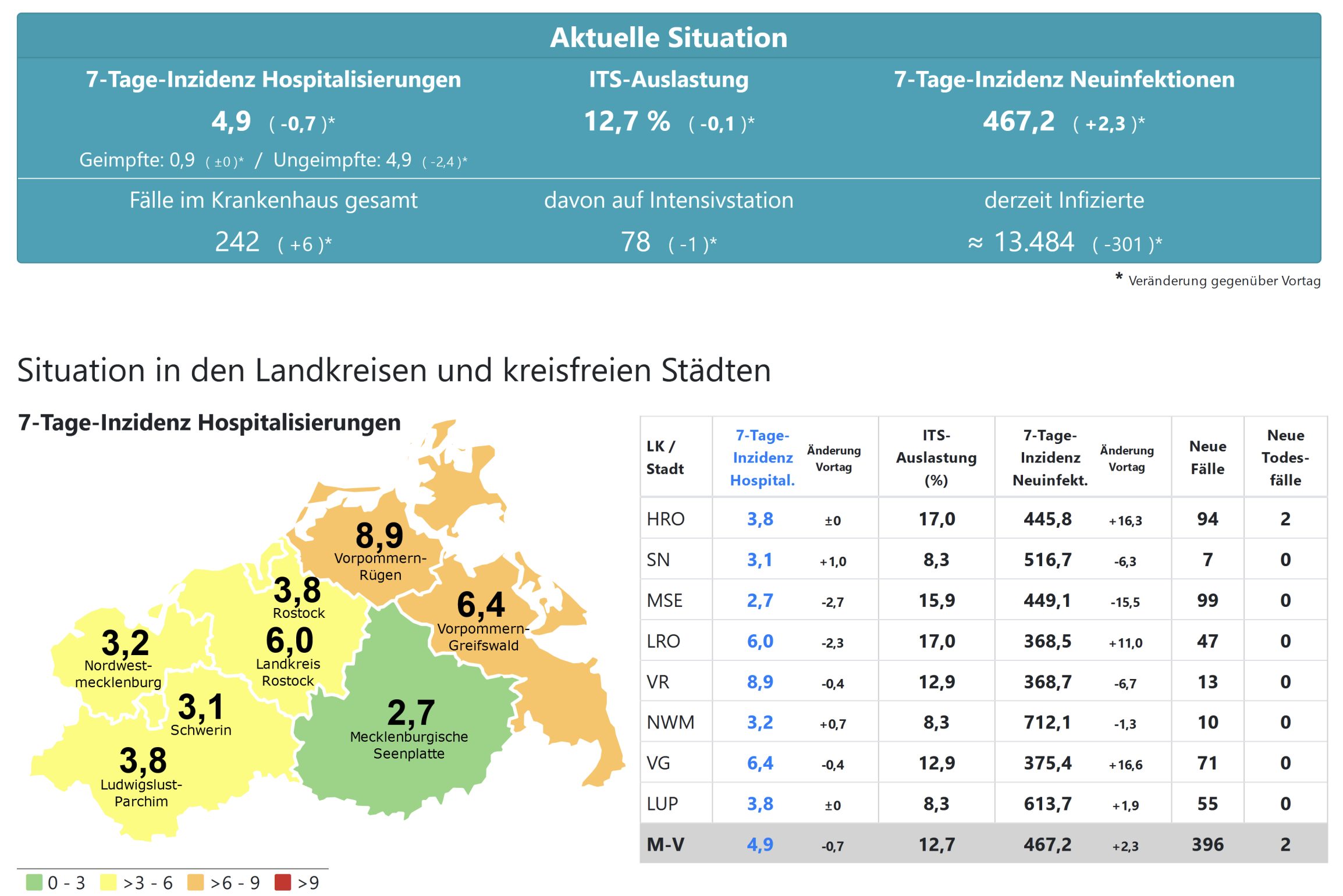 Die Hospitalisierung in ganz Mecklenburg-Vorpommern liegt heute bei 4,9, die Inzidenz des Landes steigt von 464,9 auf 467,2. Das Land Mecklenburg-Vorpommern meldet heute 396 Neuinfektionen und zwei neue Todesfälle.
