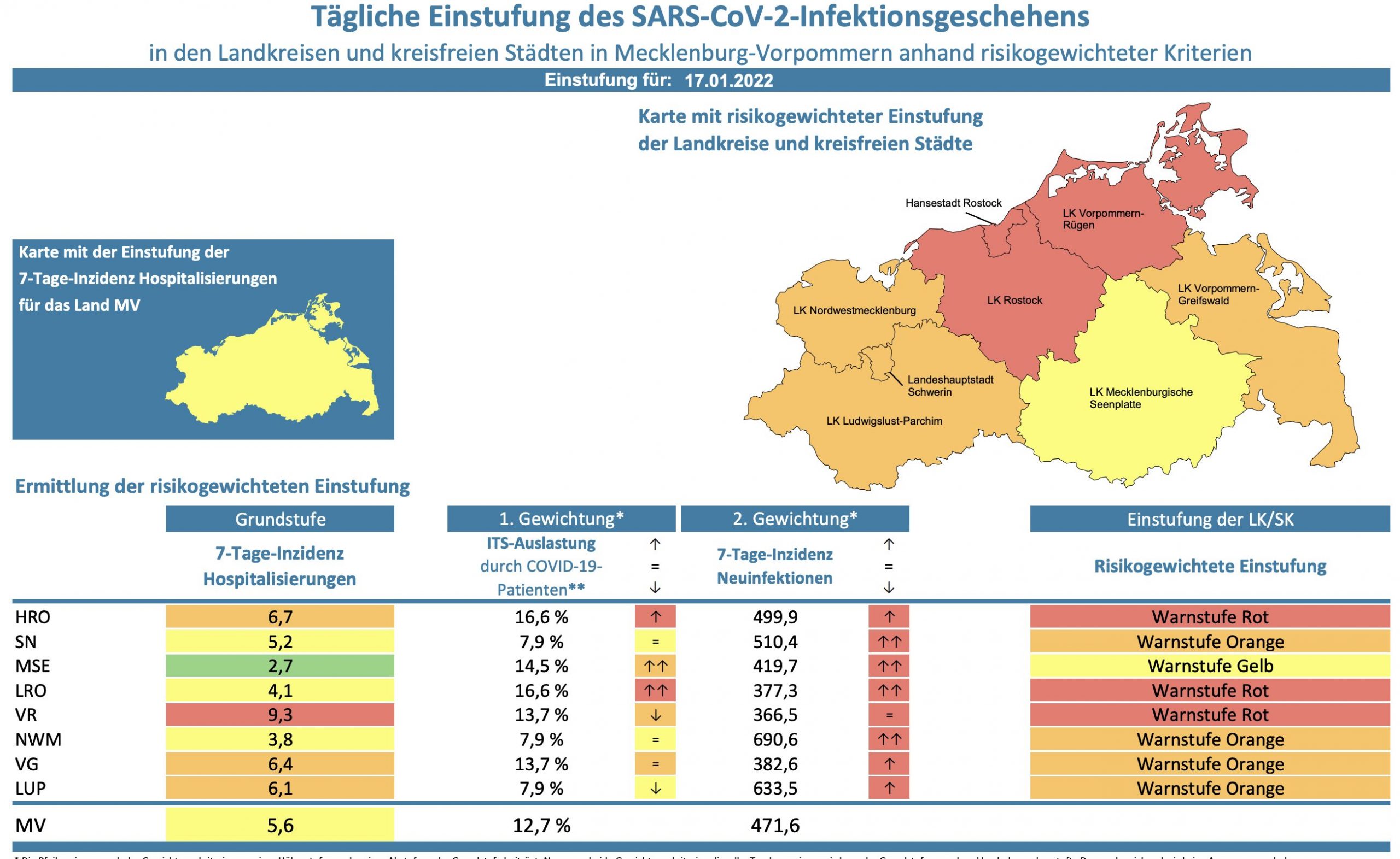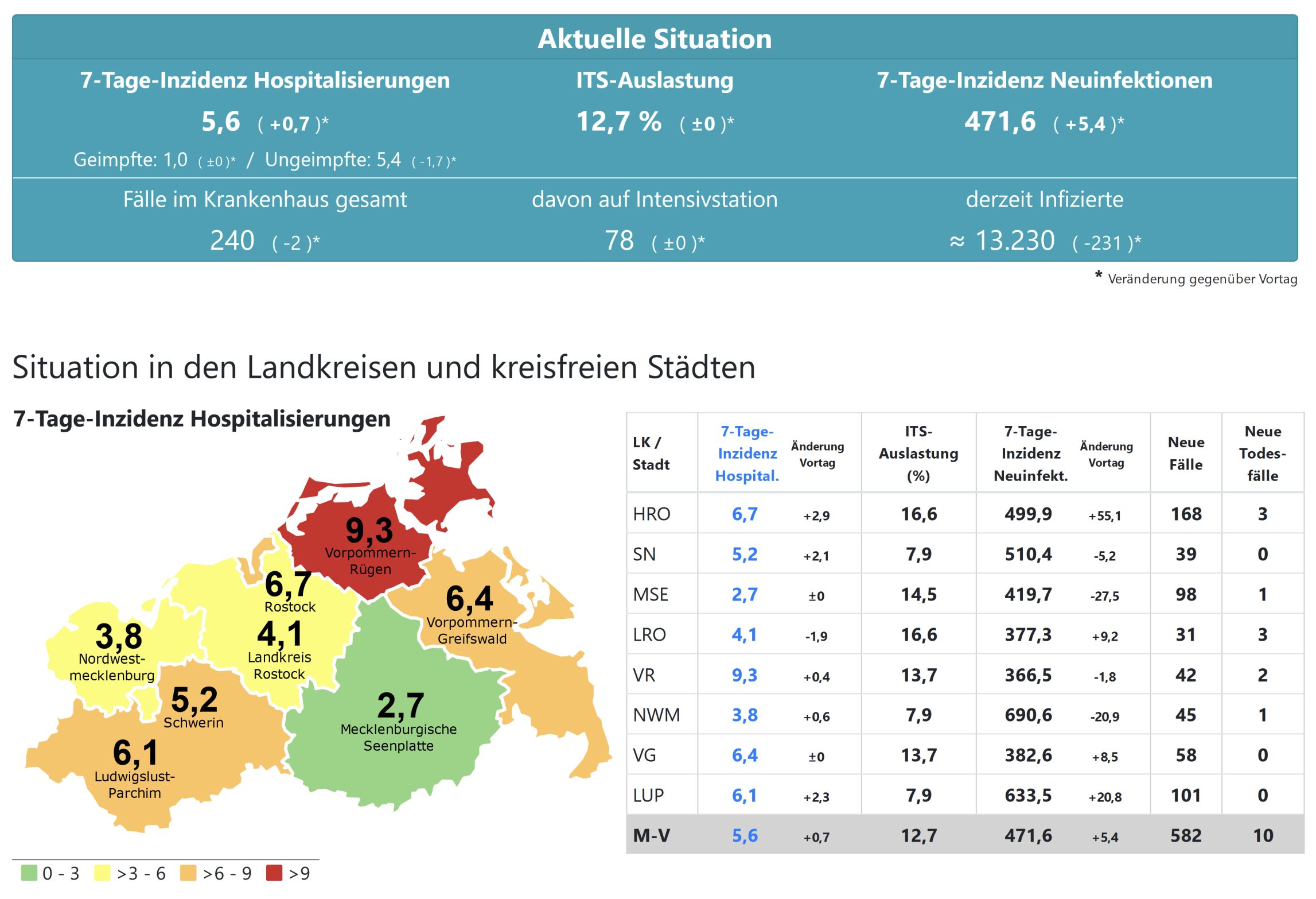 Die Hospitalisierung in ganz Mecklenburg-Vorpommern liegt heute bei 5,6, die Inzidenz des Landes steigt von 467,2 auf 471,6. Das Land Mecklenburg-Vorpommern meldet heute 582 Neuinfektionen und zehn neue Todesfälle.