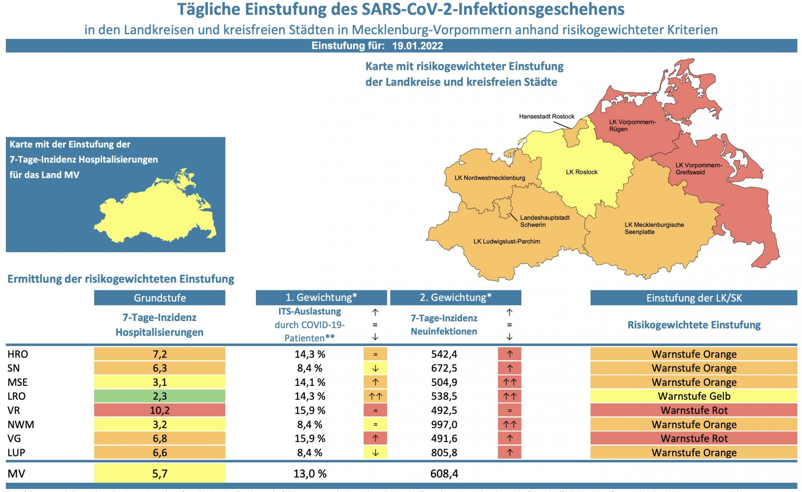 Die Hospitalisierung in ganz Mecklenburg-Vorpommern liegt heute bei 5,7, die Inzidenz des Landes steigt von 534,1 auf 608,4. Das Land Mecklenburg-Vorpommern meldet heute 2505 Neuinfektionen und sieben neue Todesfälle.