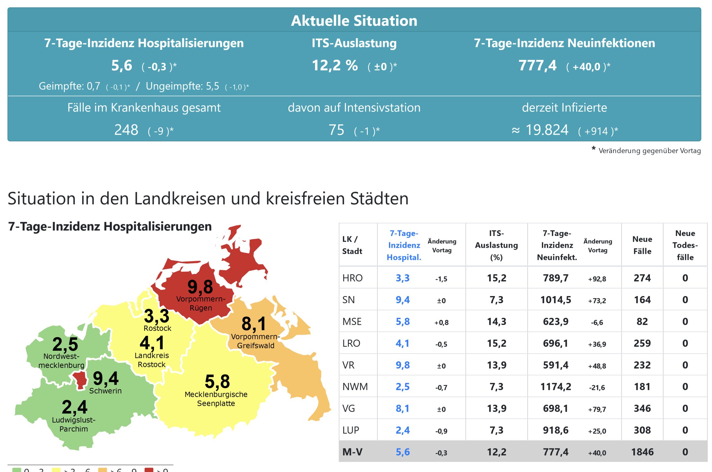 Die Hospitalisierung in ganz Mecklenburg-Vorpommern liegt heute bei 5,6, die Inzidenz des Landes steigt von 737,7 auf 777,4. Das Land Mecklenburg-Vorpommern meldet heute 1846 Neuinfektionen und keinen neuen Todesfall.