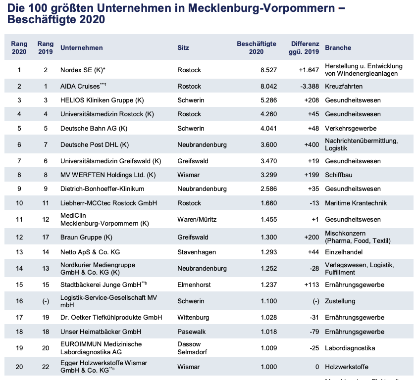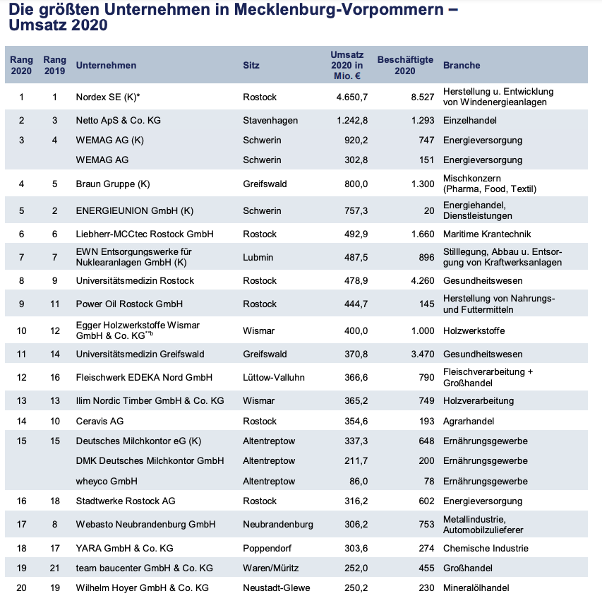 Die Beschäftigtenzahlen beruhen auf Angaben der befragten Unternehmen und geben in der Regel den Durchschnitt des Geschäftsjahres 2020 wieder. Die Unternehmen wurden bei der Befragung gebeten, die Mitarbeiterzahlen in Vollzeitbeschäftigte umzurechnen, um die Vergleichbarkeit infolge der unterschiedlich hohen Teilzeitquoten in einzelnen Branchen (z. B. Gebäudereinigung, Einzelhandel) zu gewährleisten. Umsatzangaben Auch die Umsatzangaben beziehen sich auf das Geschäftsjahr 2020. In der Umsatzrangliste sind keine Kreditinstitute oder Versicherungsunternehmen enthalten, da diese keinen Umsatz im engeren Sinne generieren. Eine Reihe bundesweit agierender Unternehmen, deren Unternehmenssitz außerhalb Mecklenburg-Vorpommerns liegt, die aber auch im Land selbst Niederlassungen oder Filialen betreiben, konnte nicht berücksichtigt werden, da sie keine landesbezogenen Angaben zur Verfügung stellen konnten.