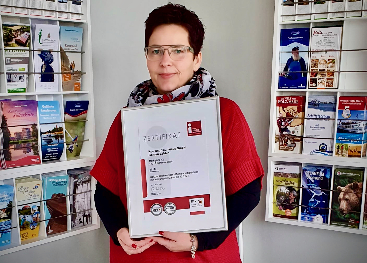 Das Team der Tourist-Information Göhren-Lebbin hat sich im Januar 2022 erneut dem deutschlandweit anerkannten Qualitätscheck gestellt und ist wieder mit dem berühmten „weißen i auf rotem Grund“ ausgezeichnet worden. Mit der Prüfung anhand der Mindestkriterien sowie weiterer 40 Kriterien wurde die Angebots- und Leistungsqualität „mit der Brille des Gastes“ unter die Lupe genommen. Mit der Zeit haben sich viele Anforderungen in Bezug auf die Leistungen gesteigert, die Gäste erwarten beste Ausstattungs-, Informations- und Servicequalität. Nur wenn Infrastruktur, Ausstattung, Angebot und Service stimmen und den Gästeerwartungen entsprechen, wird schließlich das charakteristischen „i“ verliehen.