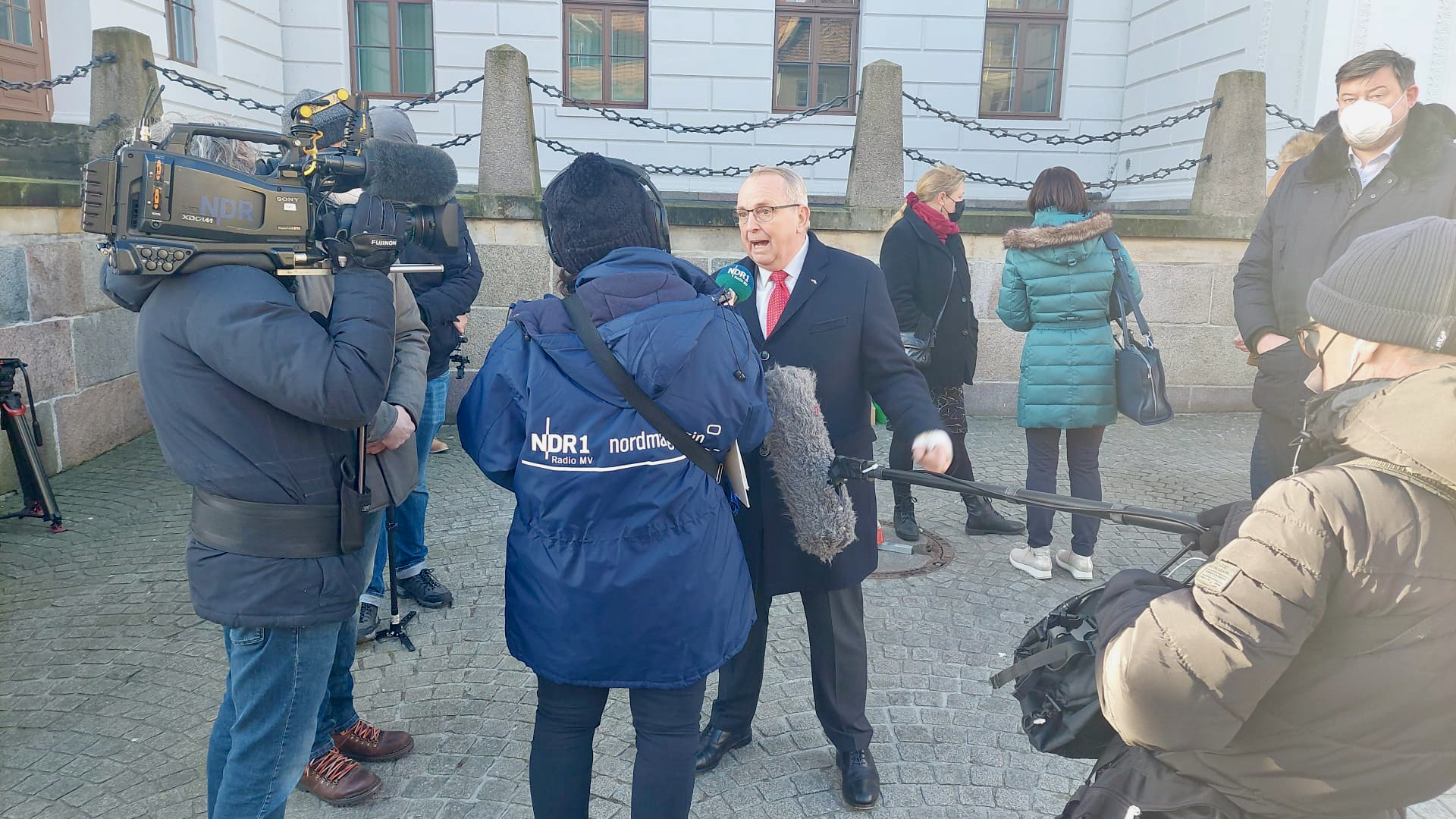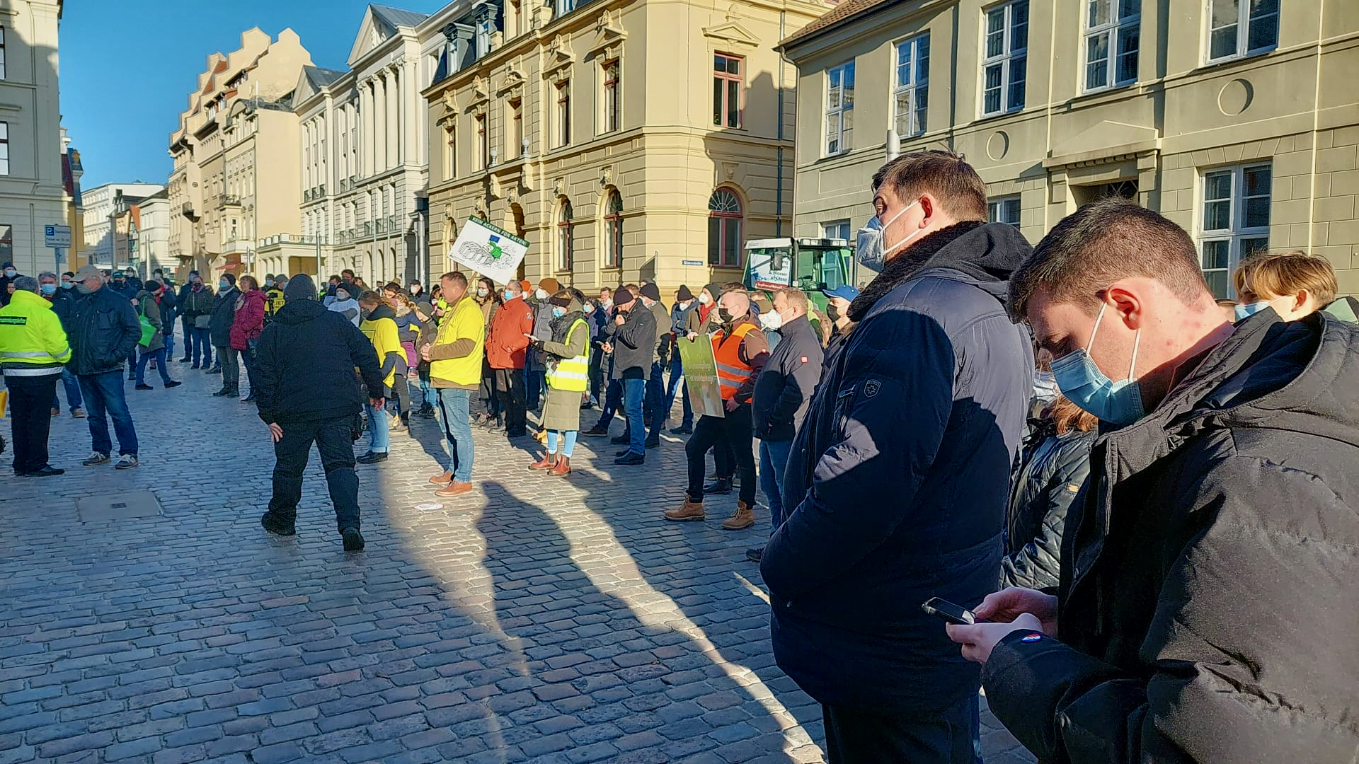 Während am Vormittag hunderte Traktoren durch Schwerin rollten und mit lautem Hupen und Transparenten protestierten, versammelten sich in der Innenstadt vor der Staatskanzlei Landwirte und übergaben einen offenen Brief an die Landesregierung.