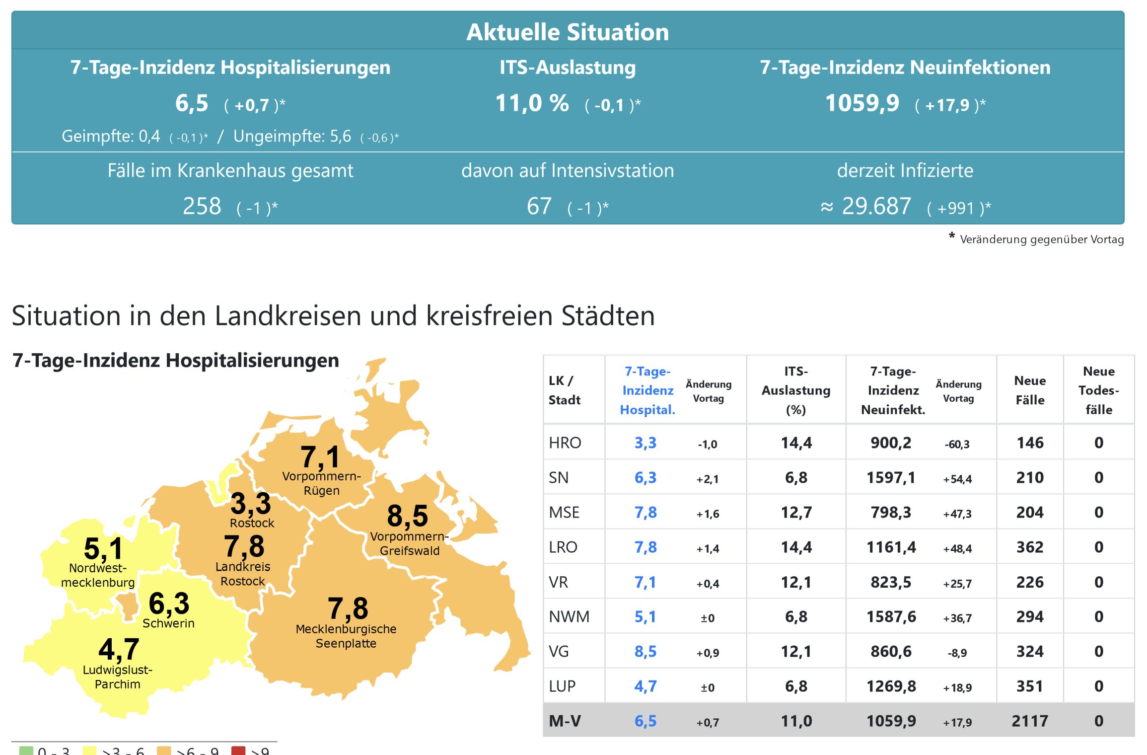 Die Hospitalisierung in ganz Mecklenburg-Vorpommern liegt heute bei 6,5, die Inzidenz des Landes steigt von 1042 auf 1059,9. Das Land Mecklenburg-Vorpommern meldet heute 2117 Neuinfektionen und keinen neuen Todesfall.