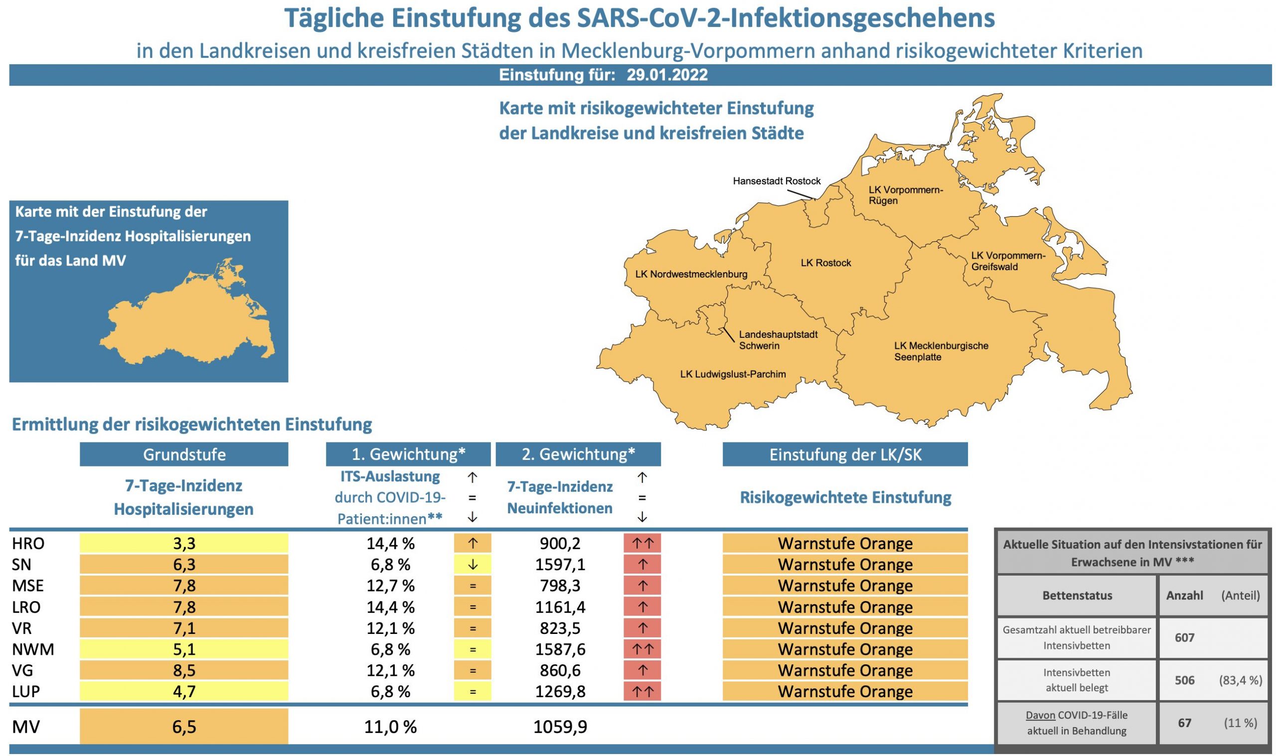 Die Landkreis-Inzidenz steigt deutlich von 751 auf 798,3. Der Hospitalisierungswert des Landkreises liegt heute bei 7,8. Der Landkreis meldet heute keinen neuen Todesfall. Auf der risikogewichteten Corona-Karte des Landes bleibt die Seenplatte “orange”, so wie ganz Mecklenburg-Vorpommern.