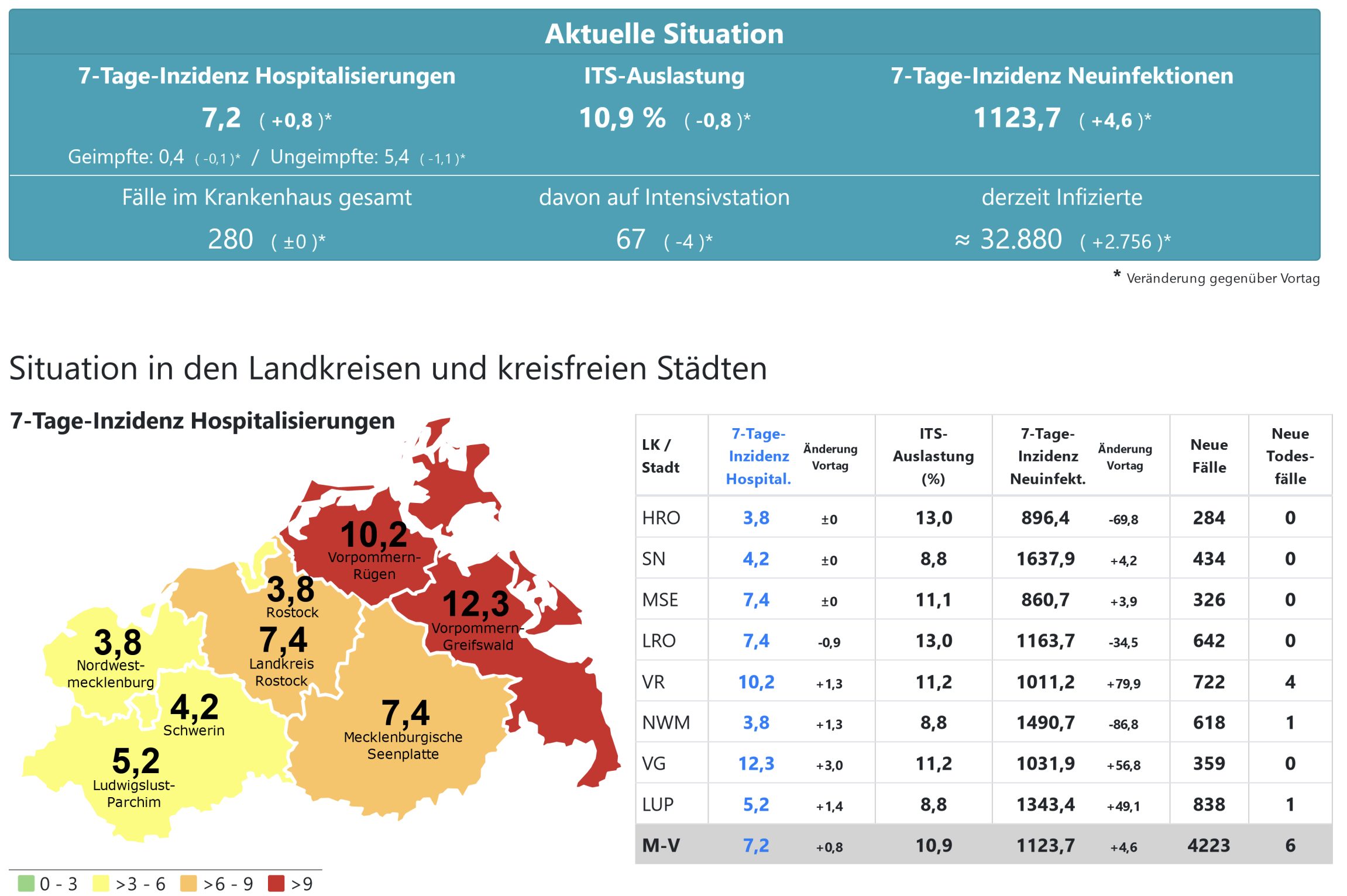 Die Hospitalisierung in ganz Mecklenburg-Vorpommern liegt heute bei 7,2, die Inzidenz des Landes steigt von 1119,7 auf 1123,7. Das Land Mecklenburg-Vorpommern meldet heute 4223 Neuinfektionen und 6 neue Todesfälle.