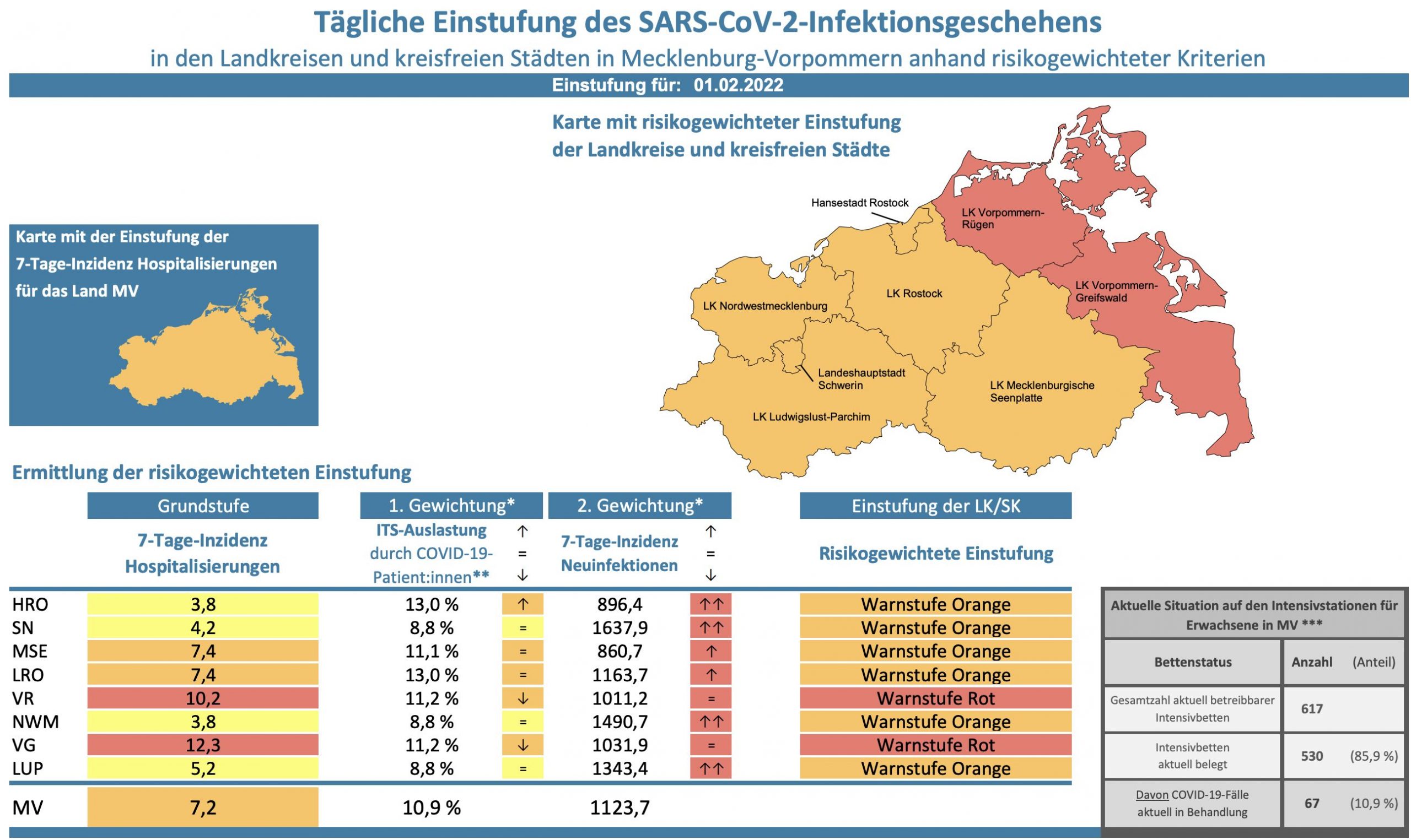 Die Landkreis-Inzidenz steigt von 856,8 auf 860,7. Der Hospitalisierungswert des Landkreises liegt heute bei 7,4. Der Landkreis meldet heute keinen neuen Todesfall. Auf der risikogewichteten Corona-Karte des Landes bleibt die Seenplatte “orange”, so wie ganz Mecklenburg-Vorpommern.