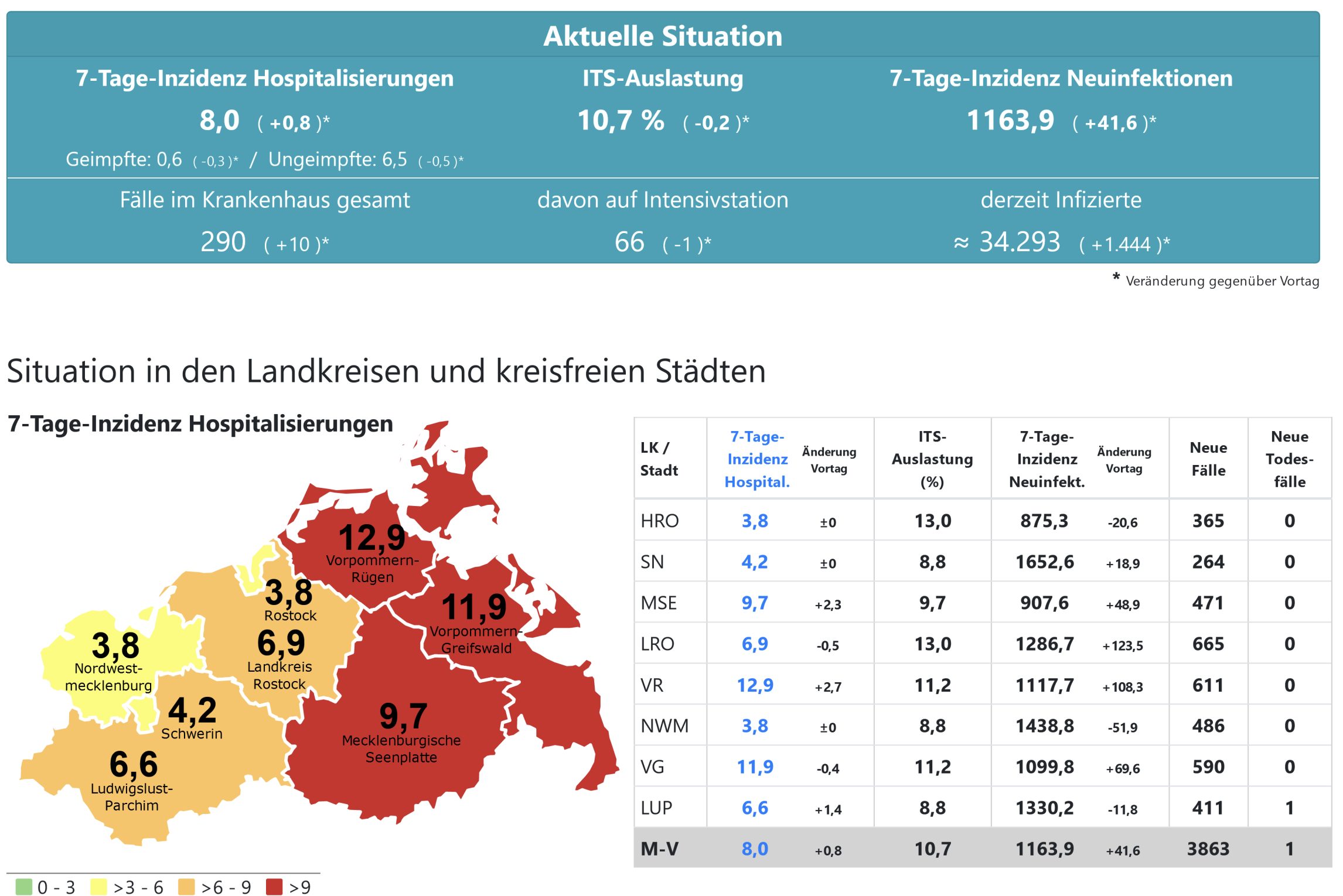 Die Hospitalisierung in ganz Mecklenburg-Vorpommern liegt heute bei 8,0, die Inzidenz des Landes steigt von 1123,7 auf 1163,9. Das Land Mecklenburg-Vorpommern meldet heute 3863 Neuinfektionen und einen neuen Todesfall.