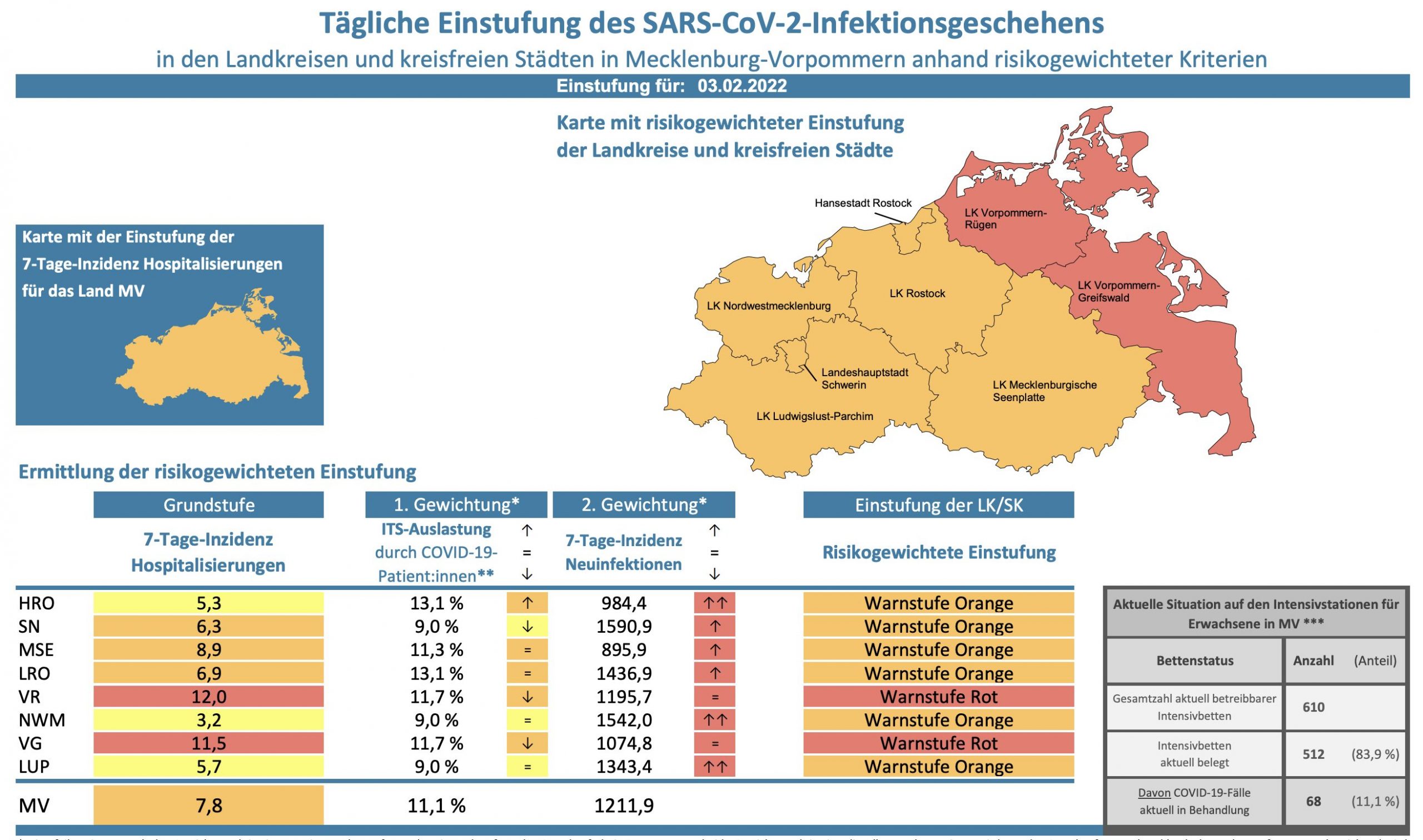 Die Hospitalisierung in ganz Mecklenburg-Vorpommern liegt heute bei 7,8, die Inzidenz des Landes steigt von 1163,9 auf 1211,9. Das Land Mecklenburg-Vorpommern meldet heute 3869 Neuinfektionen und zwei neue Todesfälle.