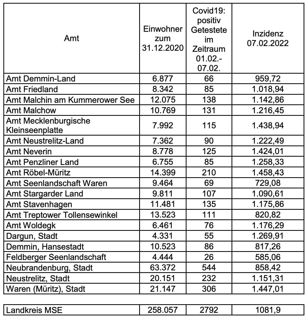 In diesem Artikel finden Sie heute auch wieder die Inzidenzen der Seenplatte – aufgeschlüsselt nach Städten und Ämtern. Demnach haben das Amt Röbel-Müritz mit 1458,43 und die Stadt Waren mit 1447,01 die höchsten Inzidenzen im Kreis.