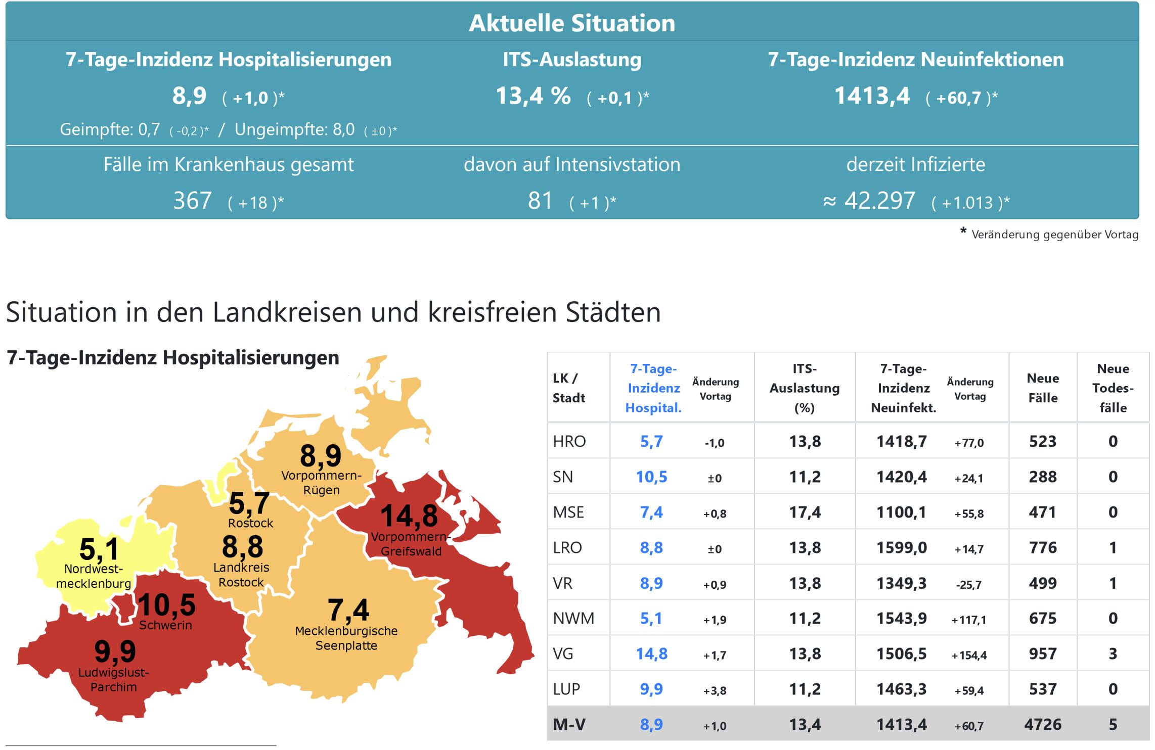 Die Hospitalisierung in ganz Mecklenburg-Vorpommern liegt heute bei 8,9, die Inzidenz des Landes steigt von 1356 auf 1413,4. Das Land Mecklenburg-Vorpommern meldet heute 4726 Neuinfektionen und fünf neue Todesfälle.