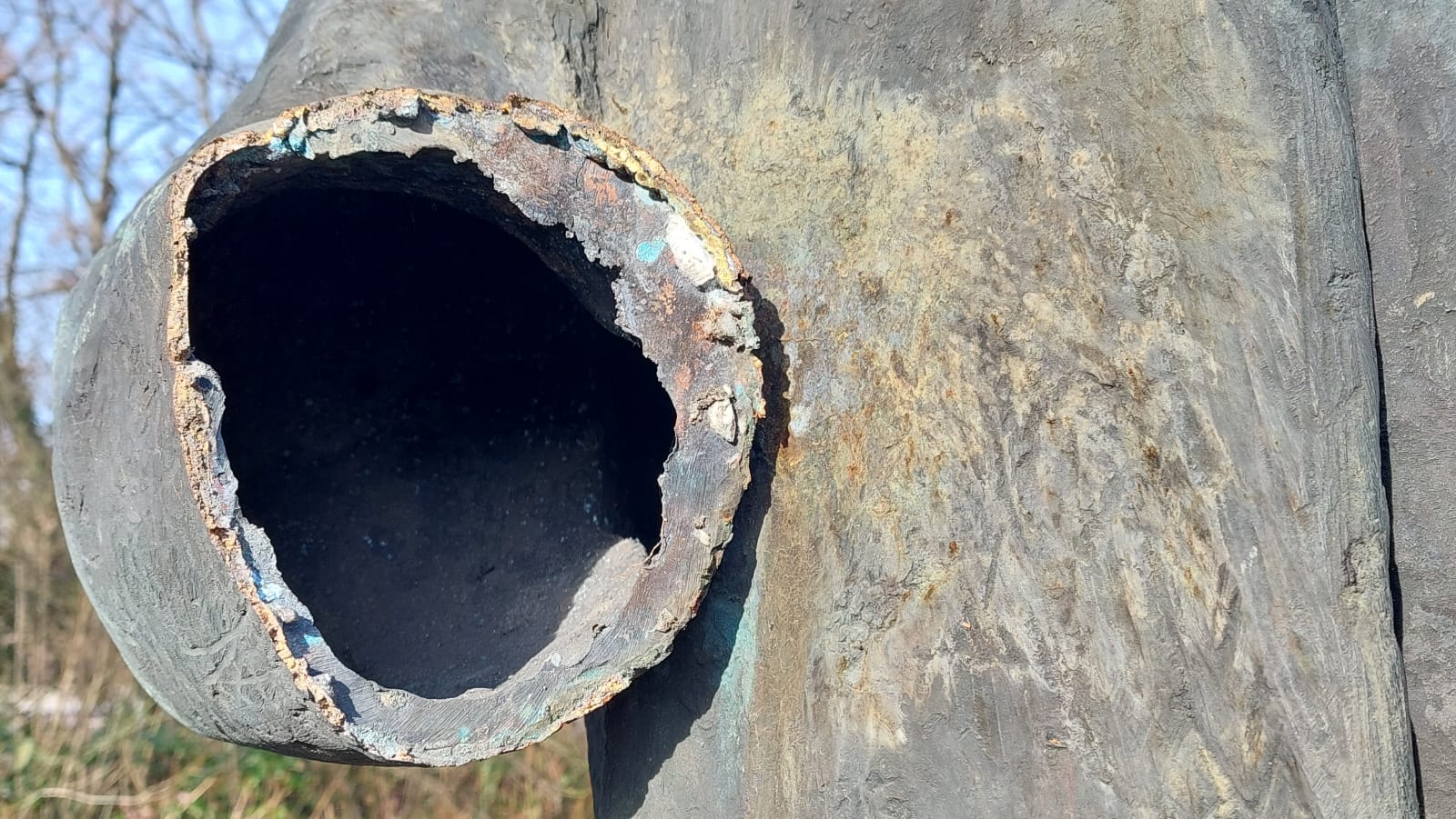 Die Suche nach der abgetrennten Hand vom Karl-Marx-Denkmal in Neubrandenburg dauert an. Bei genauem Hinsehen müssen die Täter einen Trennschleifer verwendet haben. das ist am Schnittbild erkennbar Zudem sind an der Statue und auf der Tafel daneben Stellen vom Funkenflug erkennbar. Die Polizei ermittelt wegen Sachbeschädigung.