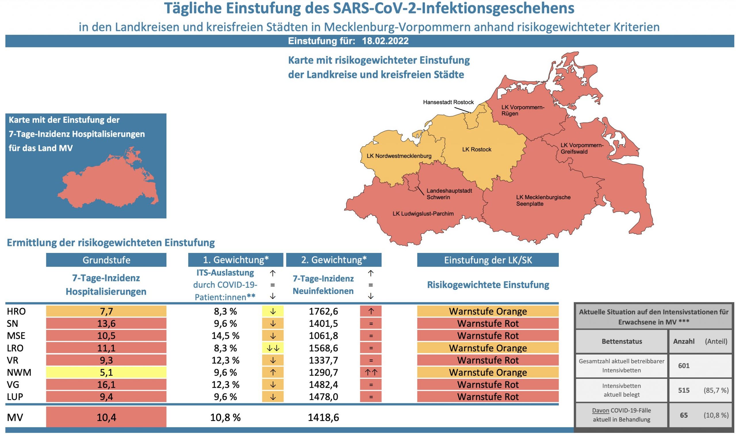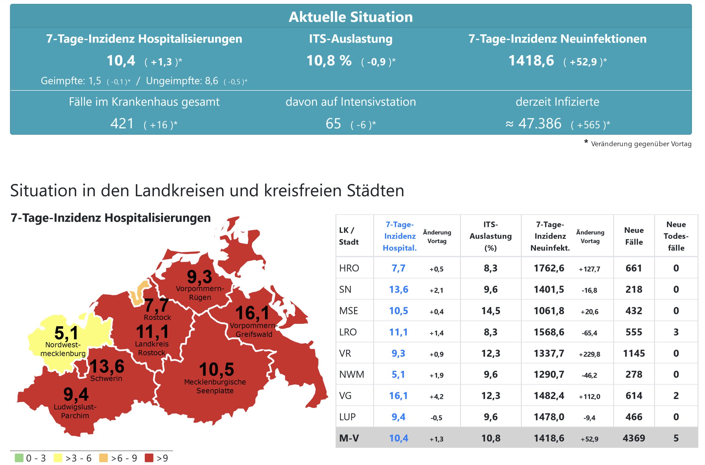 Die Hospitalisierung in ganz Mecklenburg-Vorpommern liegt heute bei 10,4, die Inzidenz des Landes steigt von 1367,0 auf 1418,6. Das Land Mecklenburg-Vorpommern meldet heute 4369 Neuinfektionen drei fünf neue Todesfälle.