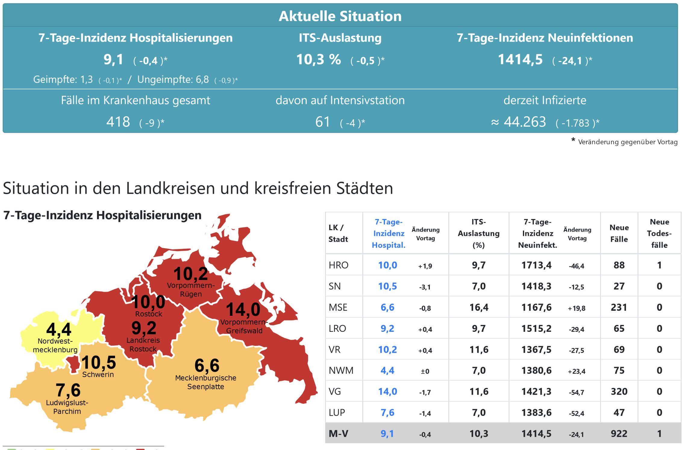 Die Hospitalisierung in ganz Mecklenburg-Vorpommern liegt heute bei 10,3, die Inzidenz des Landes sinkt auf 1414,5. Das Land Mecklenburg-Vorpommern meldet heute 922 Neuinfektionen einen neuen Todesfall.