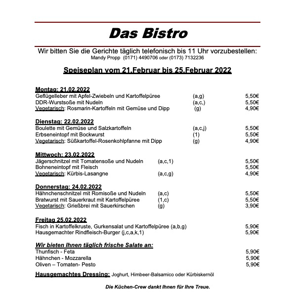 Nach zwei Wochen Pause ist das Team von „Das Bistro“ am Warener Amtsbrink ab heute wieder für die hungrigen Kunden da. Los geht’s heute mit Geflügelleber, Nudeln mit DDR-Wurstsoße sowie Rosmarin-Kartoffeln mit Gemüse.