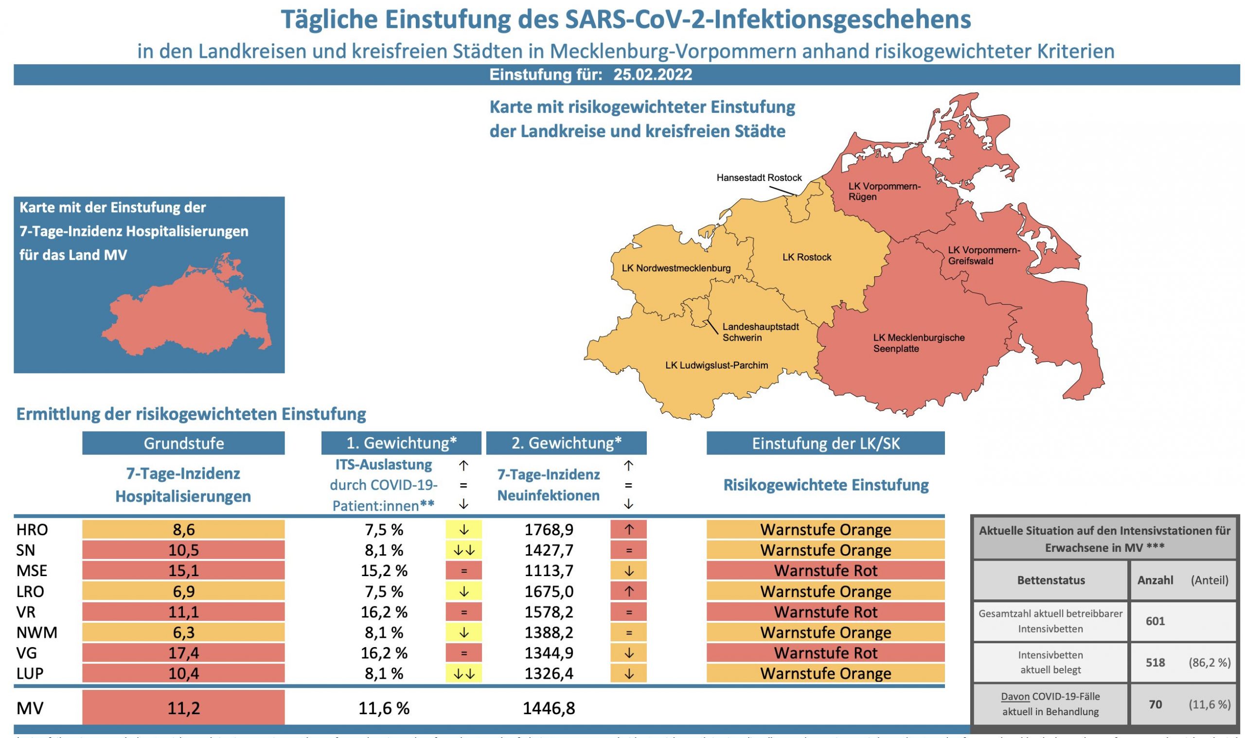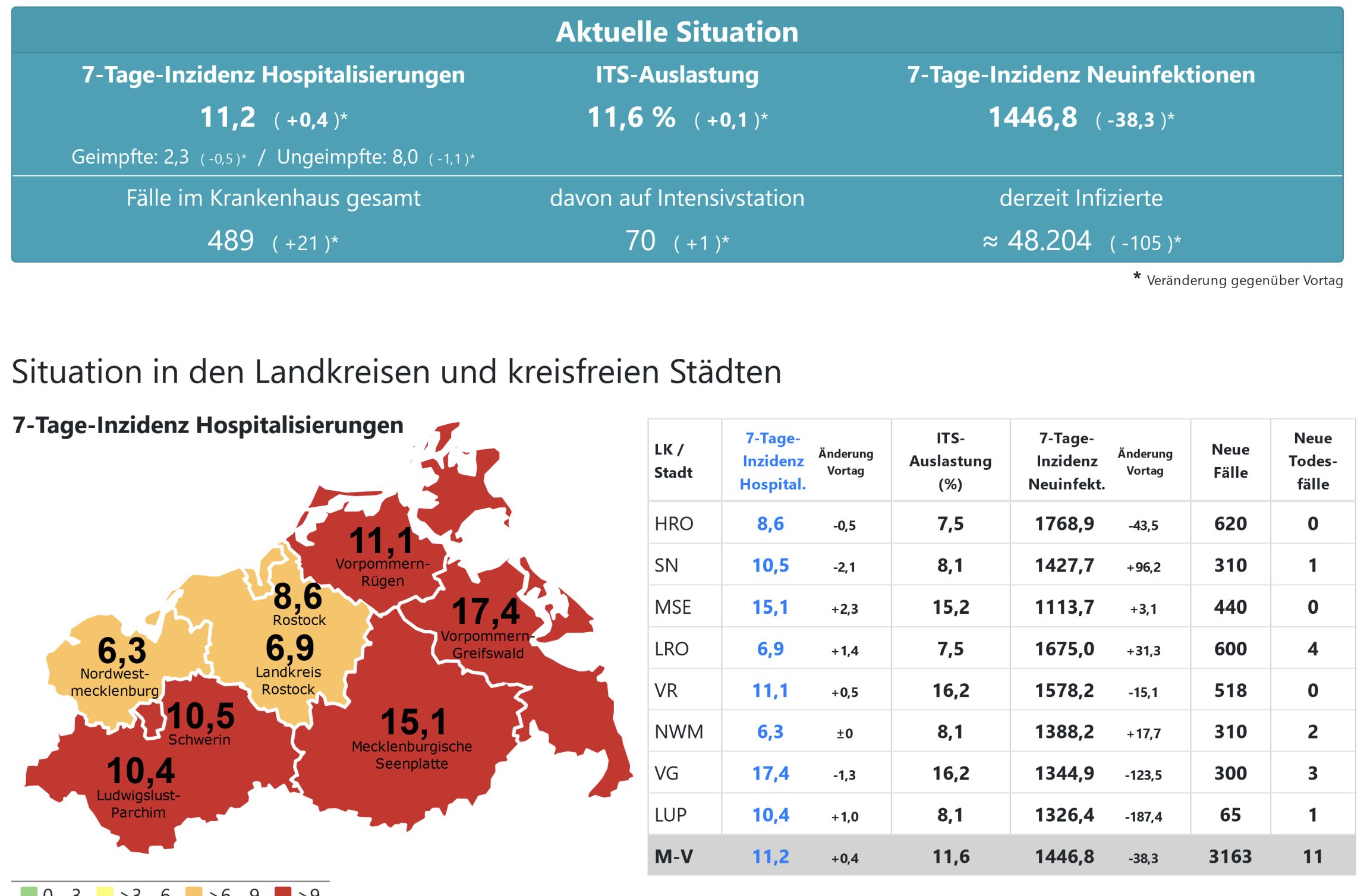 Die Hospitalisierung in ganz Mecklenburg-Vorpommern liegt heute bei 11,2, die Inzidenz des Landes sinkt von 1486,3 auf 1446,8. Das Land Mecklenburg-Vorpommern meldet heute 3163 Neuinfektionen und elf neue Todesfälle.