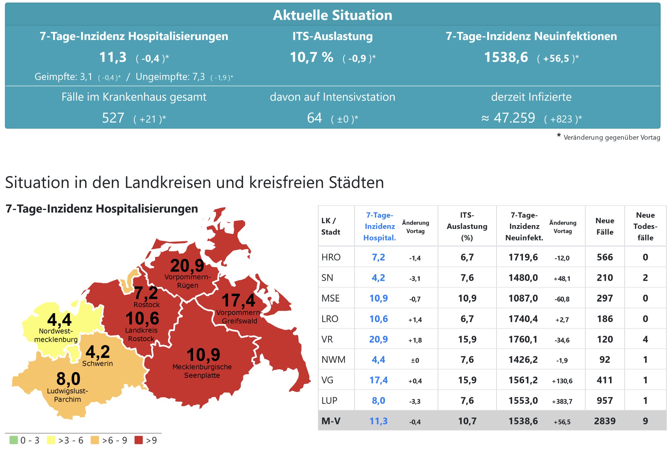 Die Hospitalisierung in ganz Mecklenburg-Vorpommern liegt heute bei 11,3, die Inzidenz des Landes steigt von 1483,3 auf 1538,6. Das Land Mecklenburg-Vorpommern meldet heute 2839 Neuinfektionen und neun neue Todesfälle.